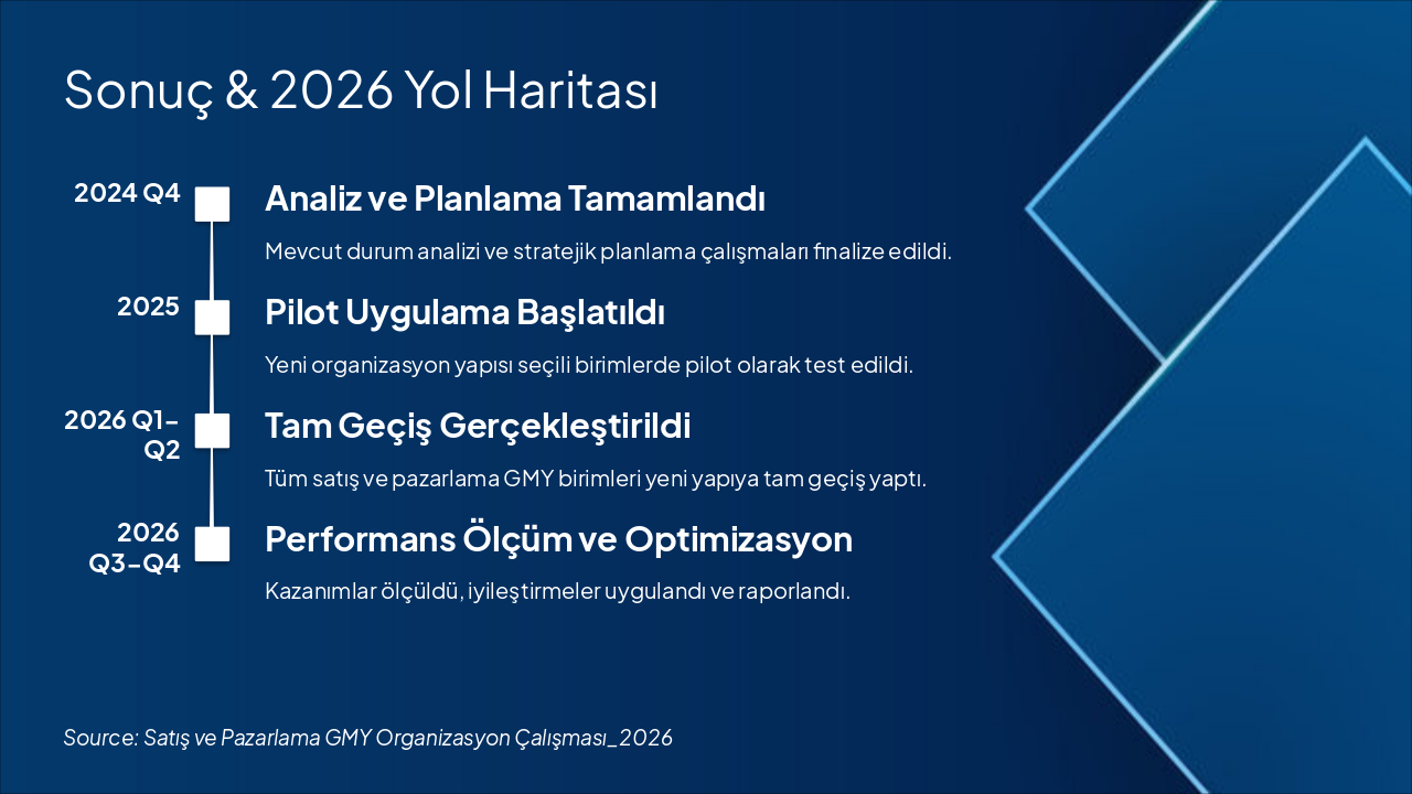 2024 Q4'te mevcut durum analizi ve stratejik planlama tamamlandı, 2025'te ise yeni organizasyon yapısı seçili birimlerde pilot olarak test edildi. 2026 Q1-Q2'de satış ve pazarlama GMY birimleri tam geçiş yaptı, Q3-Q4'de ise performans ölçümü, optimizasyon ve raporlama gerçekleştirildi.