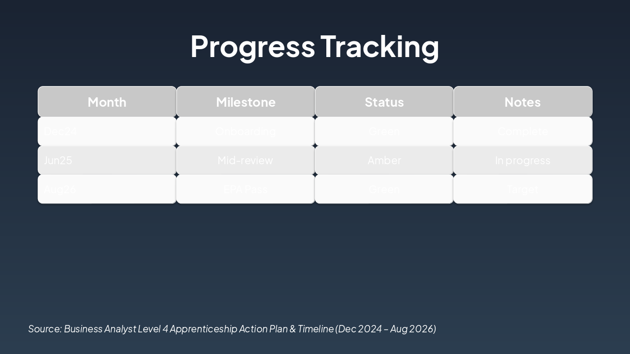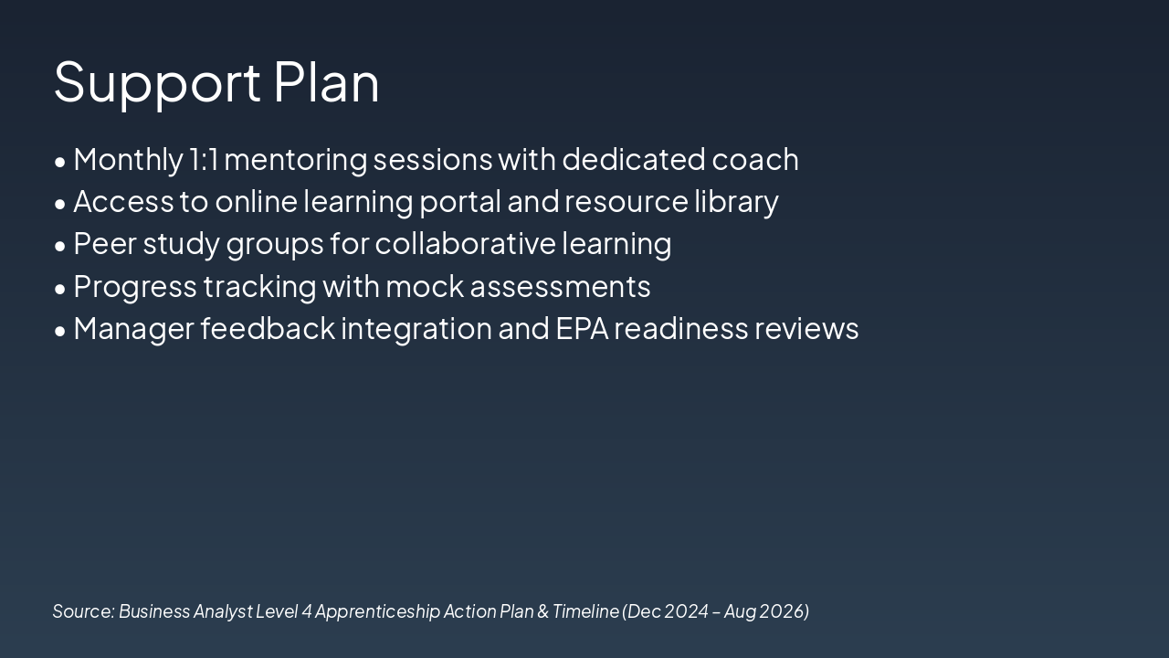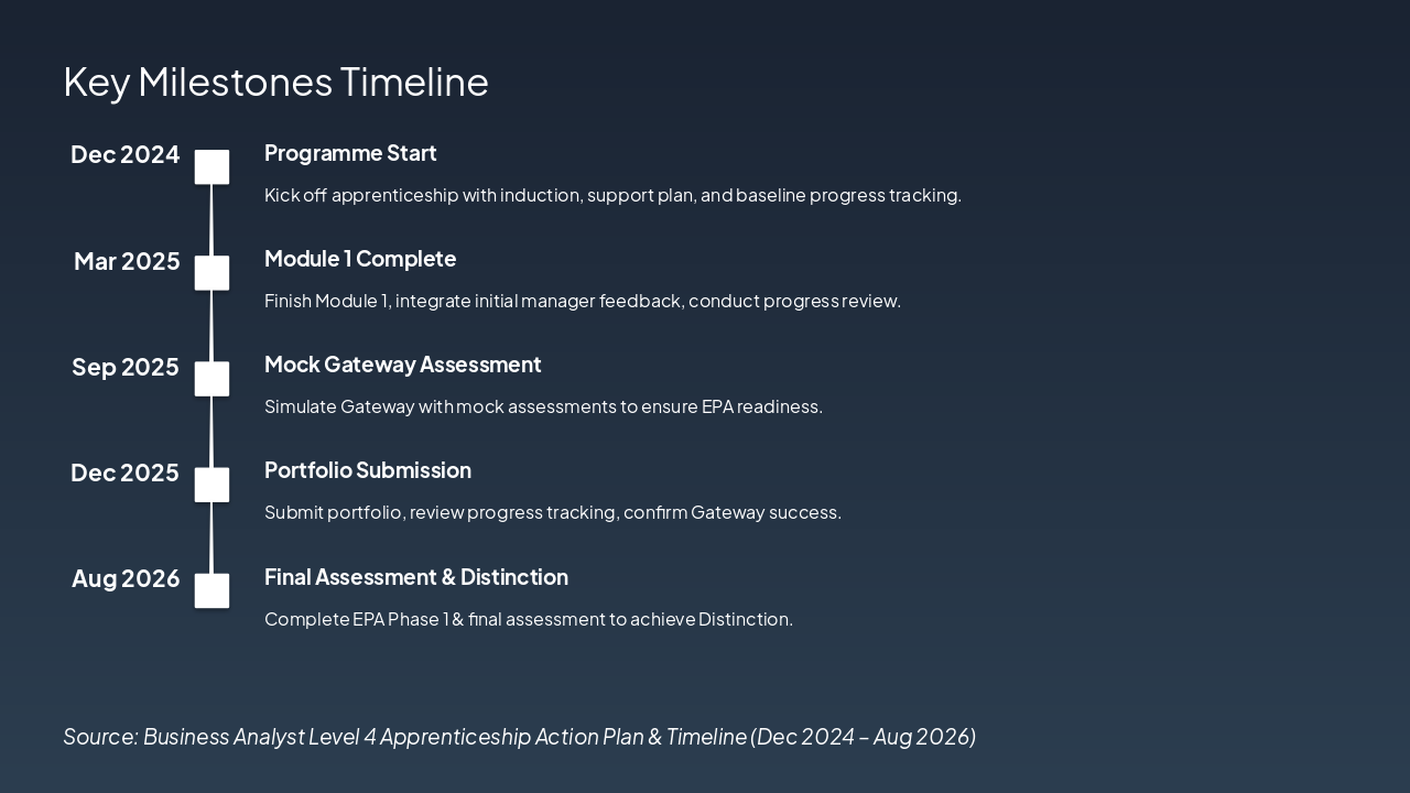 Source: Business Analyst Level 4 Apprenticeship Action Plan & Timeline (Dec 2024 – Aug 2026)