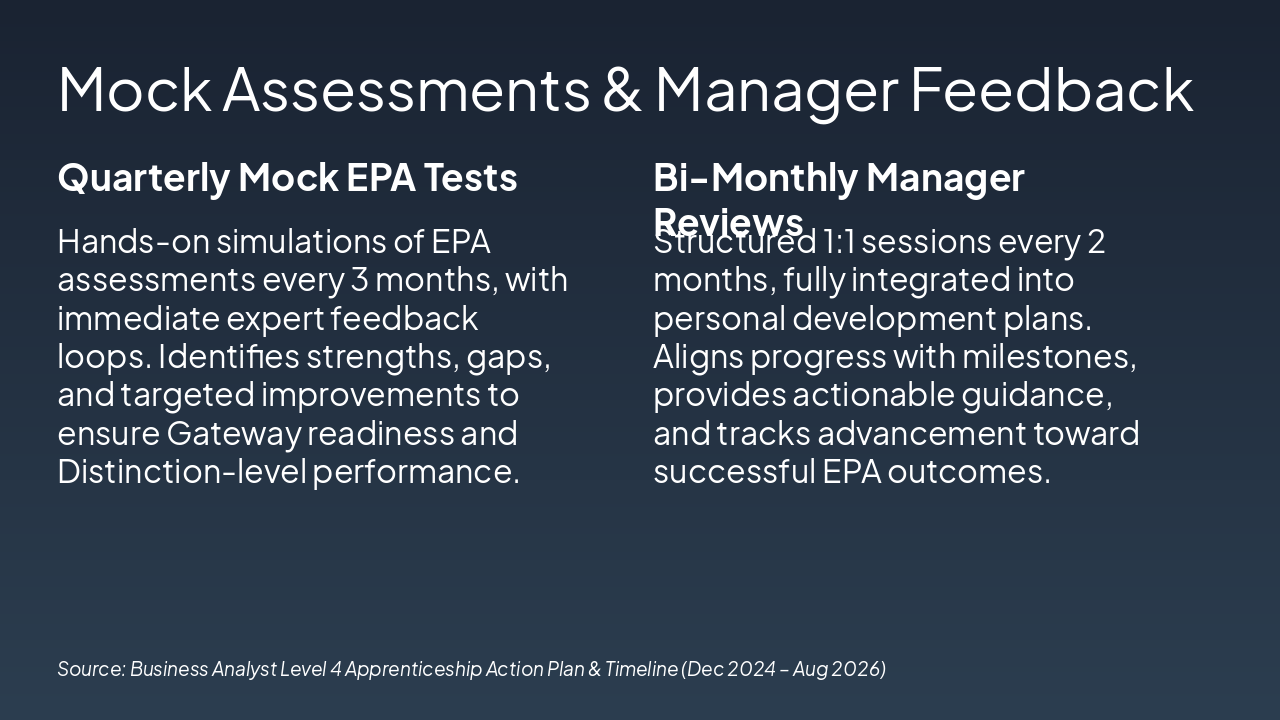 Dec 2024: Programme Start Kick off apprenticeship with induction, support plan, and baseline progress tracking. Mar 2025: Module 1 Complete Finish Module 1, integrate initial manager feedback, conduct progress review. Sep 2025: Mock Gateway Assessment Simulate Gateway with mock assessments to ensure EPA readiness. Dec 2025: Portfolio Submission Submit portfolio, review progress tracking, confirm Gateway success. Aug 2026: Final Assessment & Distinction Complete EPA Phase 1 & final assessment to achieve Distinction.