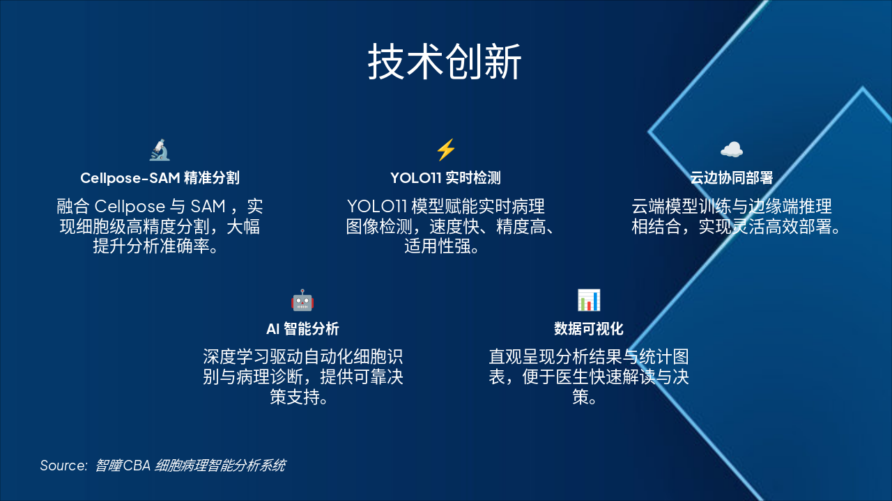 本滑页展示技术创新功能网格,包括Cellpose-SAM精准细胞分割、YOLO11实时检测、云边协同部署、AI智能分析及数据可视化。 这些特性融合先进AI模型,提升病理图像分析的精度、速度与部署灵活性,并提供直观决策支持。