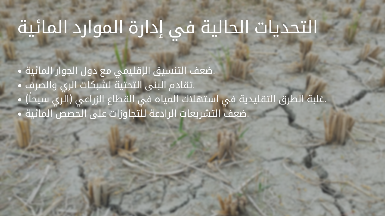 دور الحكومة وضع سياسات استراتيجية، التفاوض دبلوماسياً على الحصص المائية، وتحديث البنية التحتية المائية.