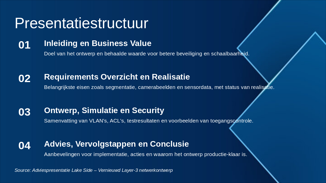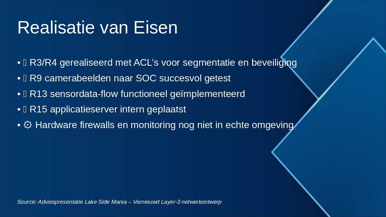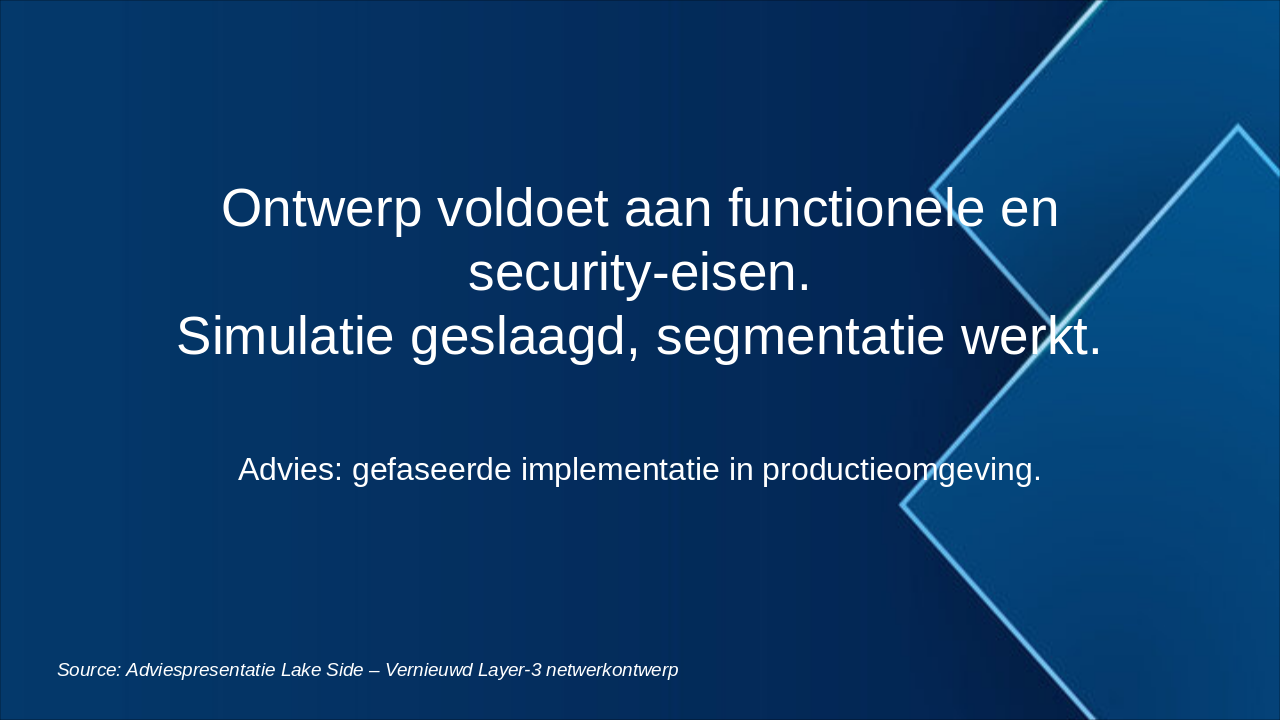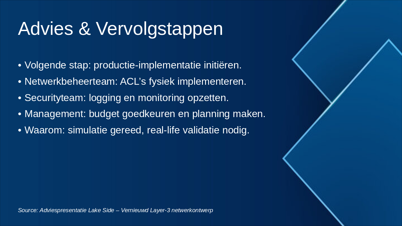 Aanbevelingen voor implementatie, acties en waarom het ontwerp productie-klaar is. Source: Adviespresentatie Lake Side – Vernieuwd Layer-3 netwerkontwerp