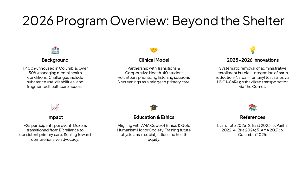 🏥 Background 1,400+ unhoused in Columbia. Over 50% managing mental health conditions. Challenges include substance use, disabilities, and fragmented healthcare access.