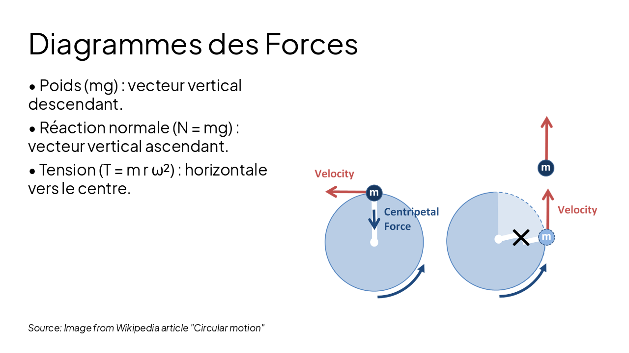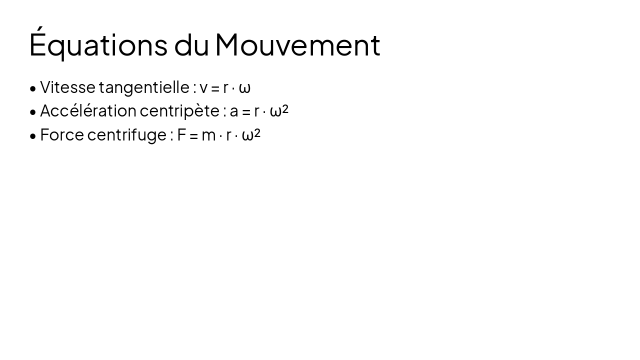 Équations du mouvement circulaire, force centrifuge et forces en jeu.