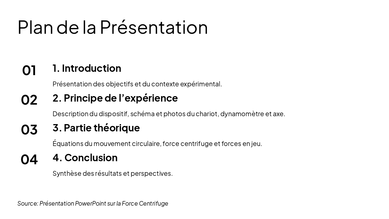 This agenda slide, titled "Plan de la Présentation," outlines four main sections of the presentation. It includes an introduction to objectives and experimental context, the experiment's principle with setup diagrams and photos, the theoretical part on circular motion equations and forces, and a conclusion with results synthesis and perspectives.