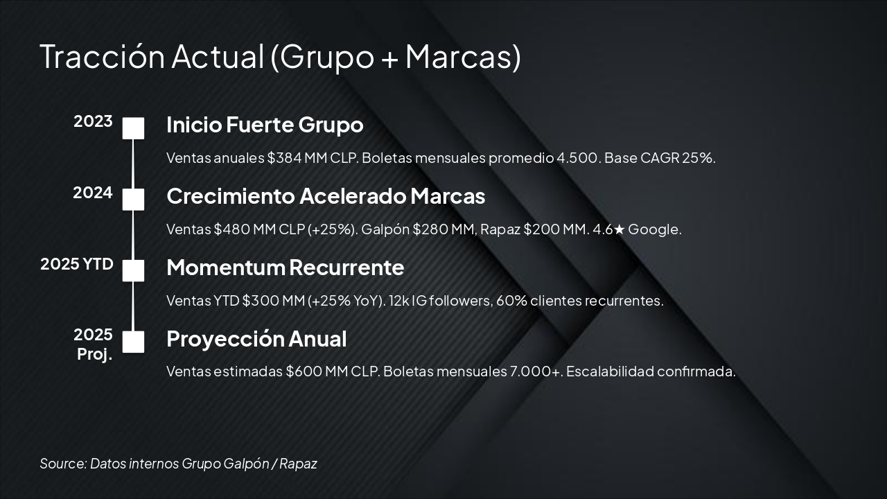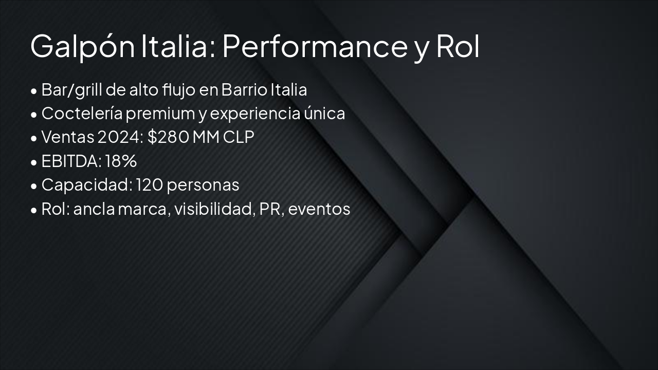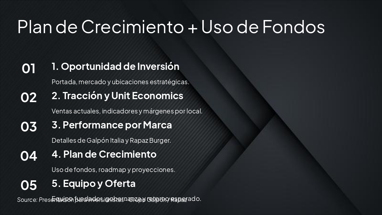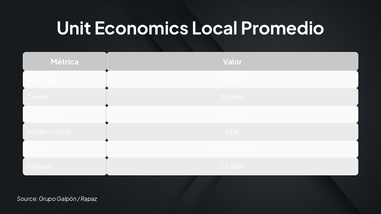 Destacar escalabilidad con métricas clave: ventas $18MM/mes, MC 60%, food cost 28%, 60% delivery. Enfocar replicabilidad para inversionistas.