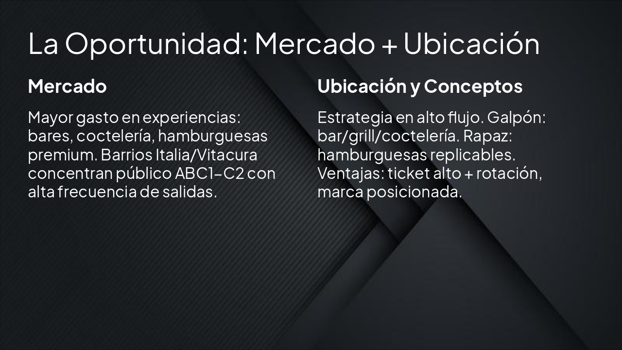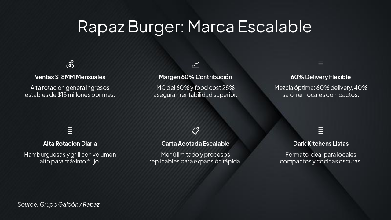 { "features": [ { "icon": "💰", "heading": "Ventas $18MM Mensuales", "description": "Alta rotación genera ingresos estables de $18 millones por mes." }, { "icon": "📈", "heading": "Margen 60% Contribución", "description": "MC del 60% y food cost 28% aseguran rentabilidad superior." }, { "icon": "🚀", "heading": "60% Delivery Flexible", "description": "Mezcla óptima: 60% delivery, 40% salón en locales compactos." }, { "icon": "🔄", "heading": "Alta Rotación Diaria", "description": "Hamburguesas y grill con volumen alto para máximo flujo." }, { "icon": "📋", "heading": "Carta Acotada Escalable", "description": "Menú limitado y procesos replicables para expansión rápida." }, { "icon": "🏪", "heading": "Dark Kitchens Listas", "description": "Formato ideal para locales compactos y cocinas oscuras." } ] }