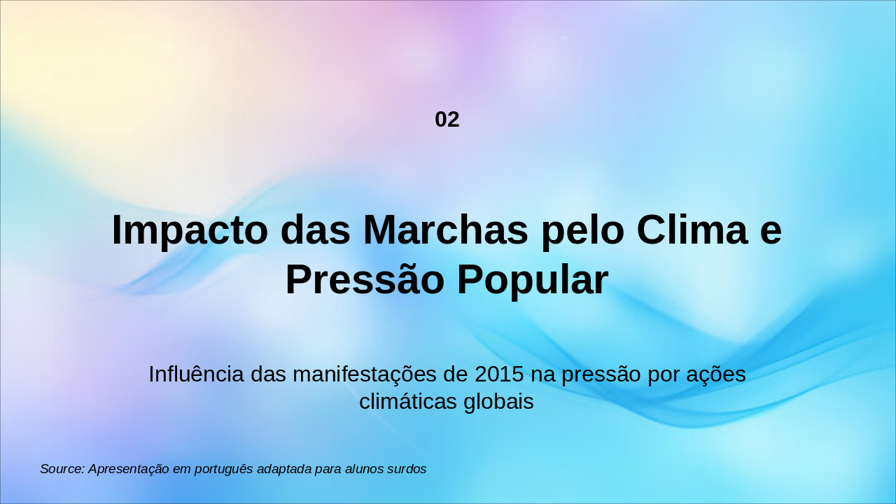 Resumo do impacto popular no Acordo de 2015: Marchas influenciaram líderes (fotos de NY, Paris, Londres, SP); Pressão de jovens, ONGs e cientistas (imagens com ícones Libras); Gráficos IPCC de temperaturas, CO₂ e gelo derretendo. Design limpo, colorido, acessível com legendas em PT e ícones Libras. Adicionar para alunos surdos.