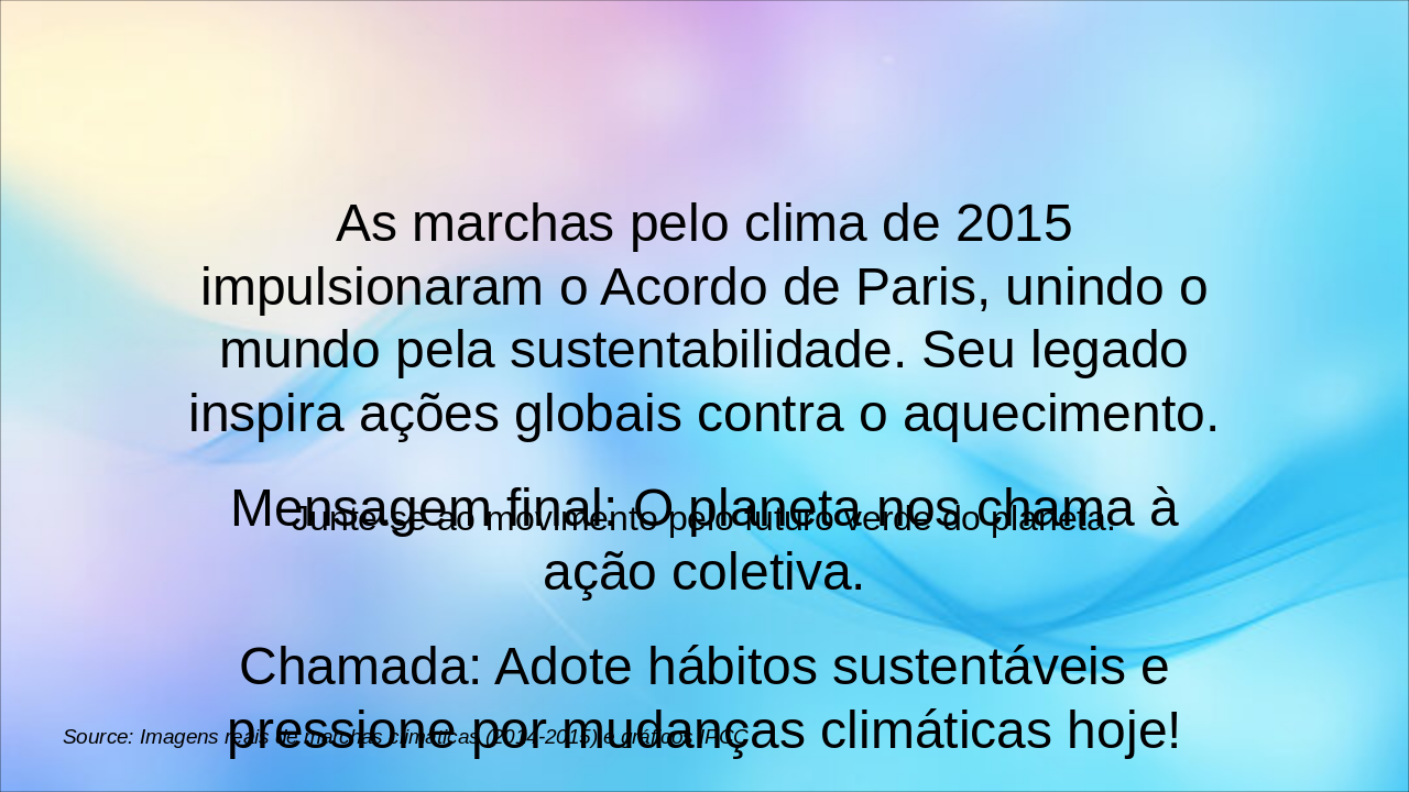 The 2015 climate marches propelled the Paris Agreement, uniting the world for sustainability and leaving a legacy that inspires global actions against warming. The slide's final message urges collective action to protect the planet, calling on viewers to adopt sustainable habits and advocate for climate change solutions today, while encouraging everyone to join the movement for a greener future.