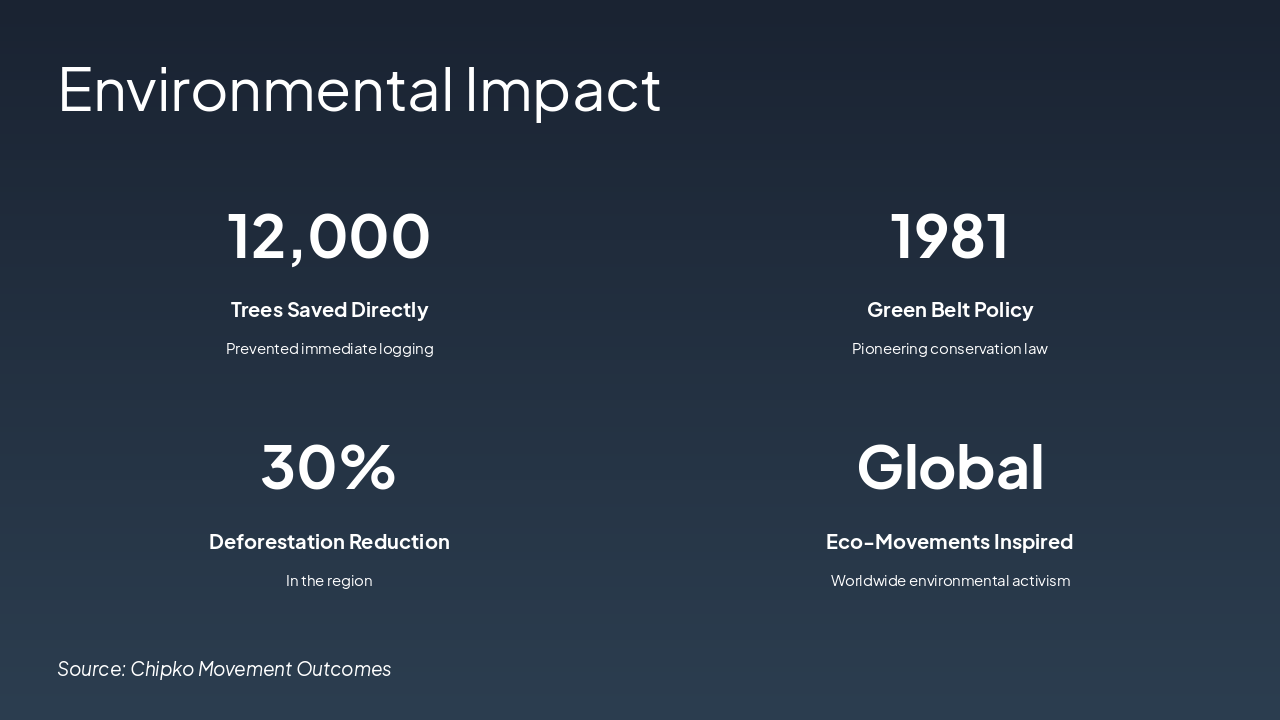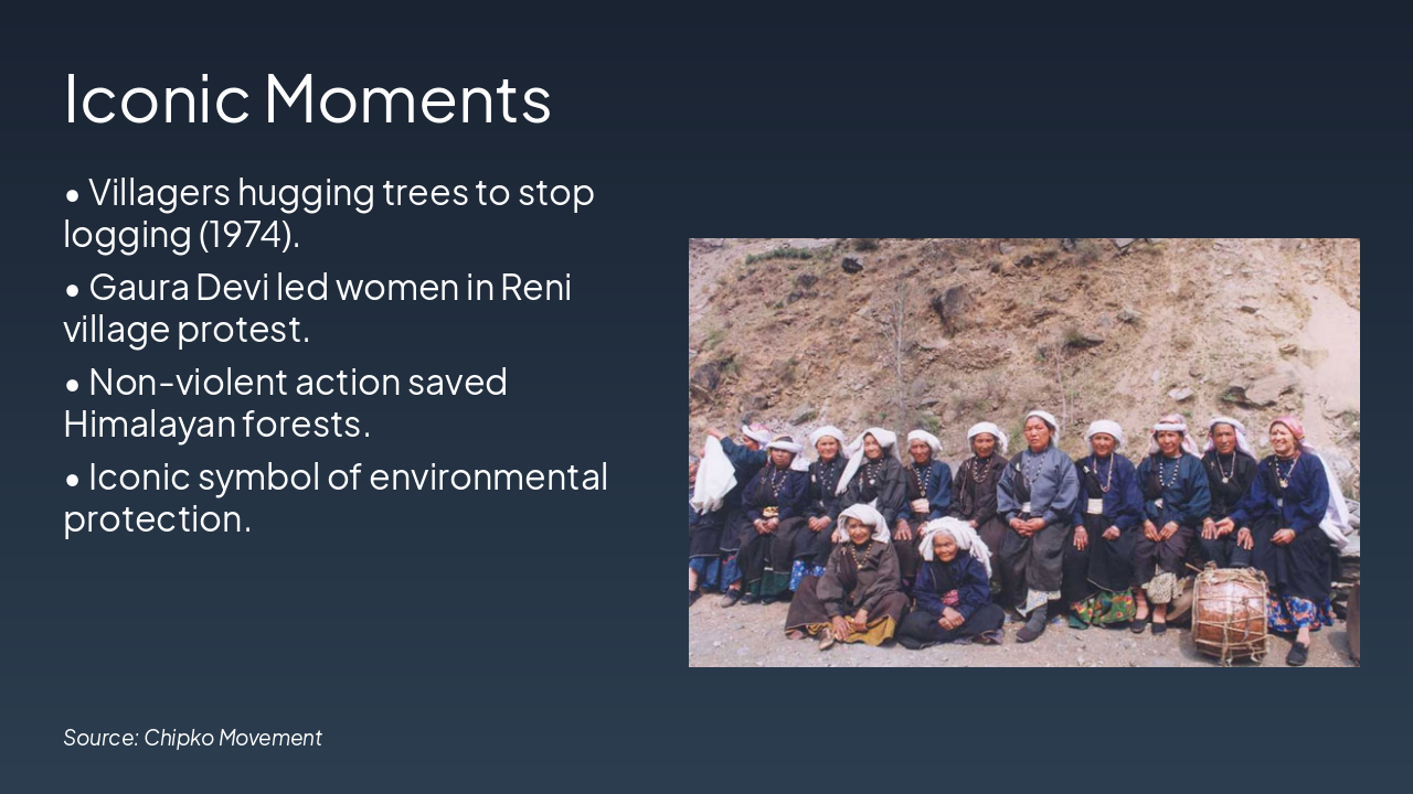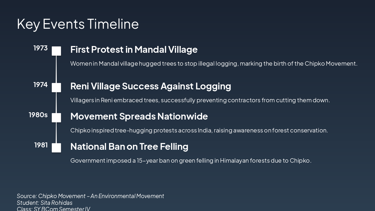 This timeline highlights the key milestones of the Chipko Movement, starting from the first protest in 1973 to the national ban in 1981. Use green natural backgrounds and insert photos of villagers hugging trees for visual impact.