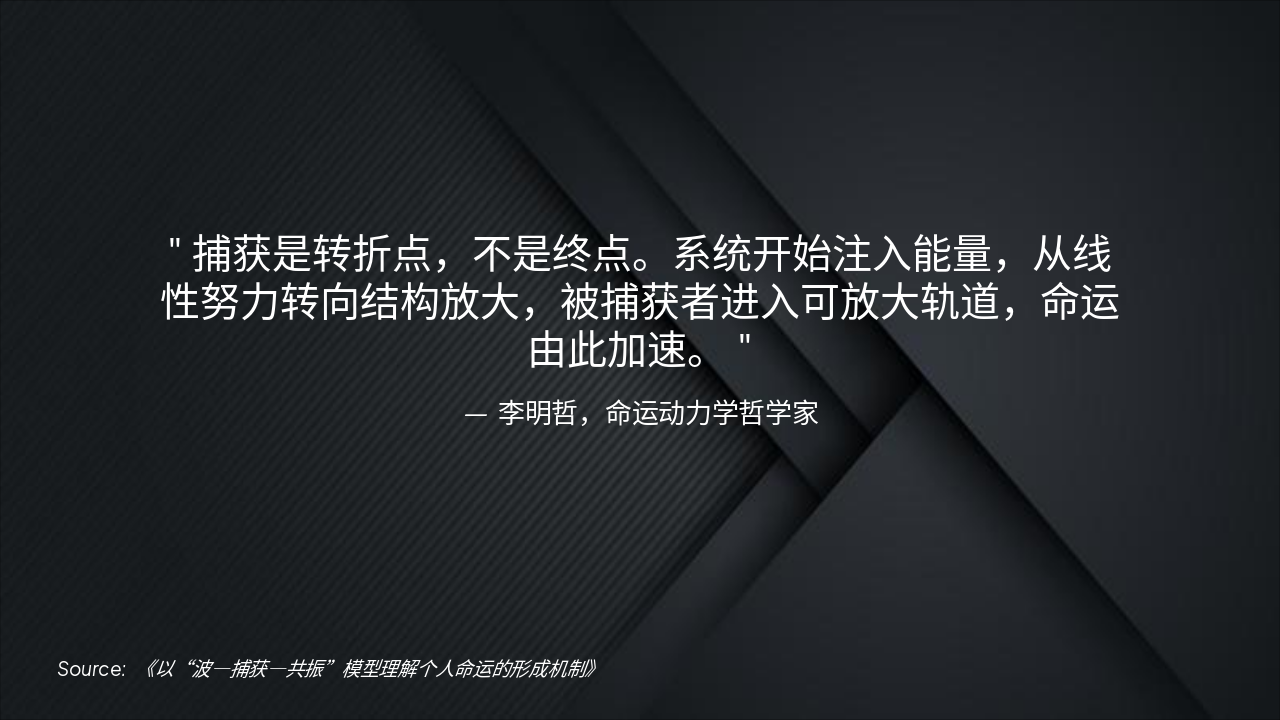 The slide title is "波—捕获—共振模型" (Wave-Capture-Resonance Model). It features the main text "理解个人命运的形成机制" (Understanding the Formation Mechanism of Personal Destiny) and subtitle "以波动态学洞察人生轨迹" (Insights into Life Trajectories through Wave Dynamics).