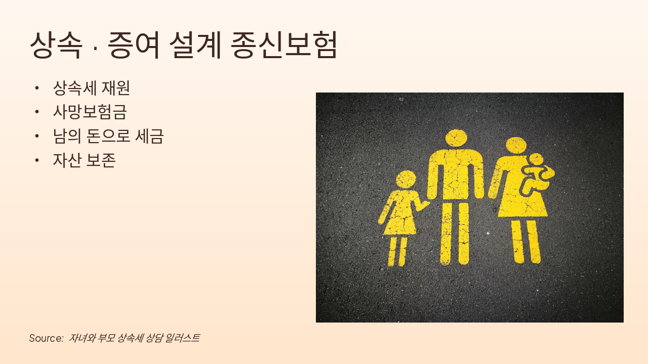기존 3장 보험 상담용 PPT를 다음 콘셉트로 시각적으로 재구성해주세요. 공통 디자인 콘셉트: - 각 슬라이드마다 사람 사진 또는 일러스트 1명 배치 (상담 장면 느낌) - 말풍선 디자인 사용 (고객 질문 / 설계사 멘트 구분) - 문장은 최소화, 핵심 키워드 위주 - 키워드는 굵게 또는 컬러 강조 - 전체적으로 세일즈 PPT 스타일 (깔끔하지만 친근) 1장: 저축성 보험 ‘입구상품’ 활용 - 이미지: 상담받는 중장년 고객 일러스트 - 말풍선(고객): "은행에 그냥 넣어두면 안 되나요?" - 말풍선(설계사): "같은 돈, 세금부터 다릅니다" - 키워드: · 은행 예금 ▶ 과세 · 저축성 보험 ▶ 비과세 · 세후 수익 ↑ · 목돈 / 적립식 모두 가능 - 하단 한 줄 메시지: "저축의 시작은 세금 구조부터" 2장: 저축성보험 대신 종신보험 스토리 - 이미지: 가족을 바라보는 가장 이미지 - 말풍선(설계사): "보장받으면서 자산도 남길 수 있습니다" - 키워드 블록: · 조기사망 대비 · 평생 사망 보장 · 해지환급금 누적 · 퇴직 후 현금자산 - 비교 키워드 작은 박스: · 저축성보험 ▶ 수익만 · 종신보험 ▶ 보장 + 환급 3장: 상속·증여 설계 종신보험 - 이미지: 자녀와 부모 일러스트 - 말풍선(설계사): "상속세는 현금입니다" - 말풍선(고객): "부동산 팔아야 하나요?" - 키워드: · 상속세 재원 · 사망보험금 · 남의 돈으로 세금 · 자산 보존 - 하단 메시지: "자산은 지키고, 세금은 대비합니다" 한글로 작성하고, 실제 영업 현장에서 바로 쓰는 느낌으로 구성해주세요.
