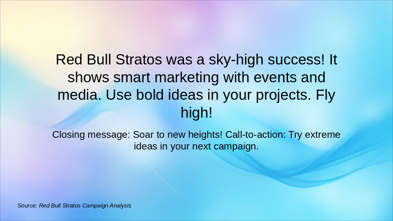 The slide's title highlights "Red Bull Stratos – The Jump from the Edge of Space," showcasing Felix Baumgartner's daring leap from the stratosphere. Its subtitle invites viewers to explore this epic event and Red Bull's innovative marketing strategy behind it.