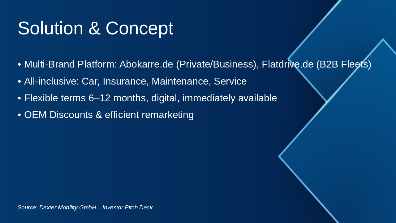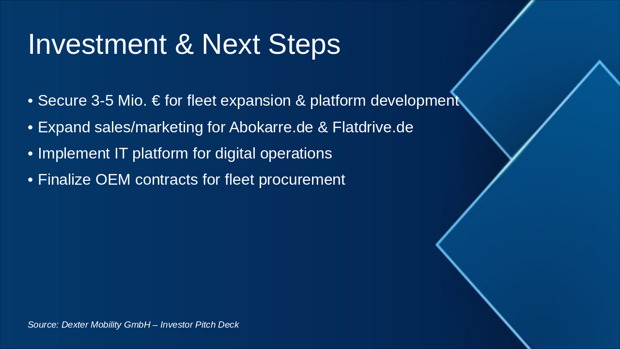 Dexter Mobility GmbH – Investor Pitch Deck **Design Style:** Tech-Startup modern, clean layout, klare Typografie (z. B. Inter, Poppins oder Open Sans), kräftige Akzentfarbe in Electric Blue (#007BFF) kombiniert mit Anthrazit (#1E1E1E) und Weiß. Dezente Animationen und Icons. --- ### 1. Cover Slide **Dexter Mobility GmbH** The Multi-Brand Auto Subscription Platform Untermarken: Abokarre.de | Flatdrive.de --- ### 2. Problem & Markt - Firmen mit bundesweiten Einsätzen (Healthcare, Handwerk, Vertrieb) benötigen flexible Mobilität. - Klassisches Leasing ist zu starr, teuer und kapitalintensiv. - Zunehmender Bedarf an Auto-Abos – insbesondere im B2B-Bereich. - Marktchance: >25.000 Fahrzeuge allein im medizinischen Sektor. --- ### 3. Lösung & Konzept - Multi-Brand Auto-Abo-Plattform: Abokarre.de (Privat & Gewerbe), Flatdrive.de (B2B-Flotten) - All-inclusive Mobilität: Fahrzeug, Versicherung, Wartung, Service. - Flexible Laufzeiten (6–12 Monate), digitale Buchung, sofortige Verfügbarkeit. - Nutzung von OEM-Flottenrabatten und Wiedervermarktung. --- ### 4. Geschäftsmodell - Einnahmen durch monatliche Abo-Gebühren. - Einkauf zu OEM-Konditionen, kurze Haltezeiten. - Wiedervermarktung nach 6–12 Monaten. - Zusatzerlöse: Remarketing, Servicepartnerschaften. --- ### 5. Markt & Wachstum - Stetig wachsender Mobility-as-a-Service-Markt in DACH. - B2B-Expansion durch Multi-Brand-Vertrieb. - Gezielter Einstieg über Healthcare, dann Ausweitung in weitere Branchen. --- ### 6. Finanzplanung & Skalierung **Umsatzprognose:** | Jahr | Fahrzeuge | Umsatz (in Mio. €) | |------|------------|--------------------| | 1 | 400 | 3,6–4,2 | | 2 | 900 | 8–11 | | 3 | 1.500 | 13–18 | **Kapitalbedarf:** 5 Mio. € (Flotte + Betriebskapital) Visualisierung: Diagramme aus Finanzplan integriert (Umsatzentwicklung, Fahrzeugwachstum, EBITDA-Projektion) --- ### 7. Wettbewerbsvorteile - Multi-Brand-Strategie für verschiedene Zielgruppen. - Zugang zu Healthcare-Kunden über Dexter Holding. - OEM-Rabatte & Buyback-Programme. - Digitale Plattform für Abwicklung & Fuhrparkmanagement. --- ### 8. Team - Gründer mit Background in Mobility, Automotive & Healthcare. - Erfahrung in Fuhrparkmanagement, Finanzierung und Vertrieb. - Netzwerk im medizinischen und gewerblichen Sektor. --- ### 9. Investment & Next Steps - 3–5 Mio. € Kapitalbedarf für Flottenaufbau & Plattformentwicklung. - Ausbau Vertrieb & Marketing für Abokarre.de & Flatdrive.de. - Implementierung IT-Plattform & OEM-Verträge. --- ### 10. Vision Dexter Mobility wird die führende Multi-Brand Mobility-Plattform in Deutschland — flexibel, digital und nachhaltig. --- ### Branding **Farben:** Electric Blue (#007BFF), Anthrazit (#1E1E1E), Weiß (#FFFFFF) **Icons:** Lucide- oder Feather-Style minimalistisch **Schriften:** Inter, Poppins oder Open Sans **Logo:** Platzhalter 'Dexter Mobility' in futurischem Font (Techlook, Blau-Grau)