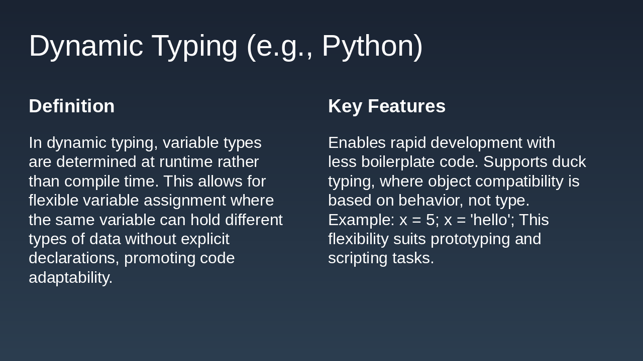 Static: Enterprise apps, systems programming (reliability). Dynamic: Scripting, web dev (speed). Summary: Choose based on project needs—static for safety, dynamic for agility. Q&A?