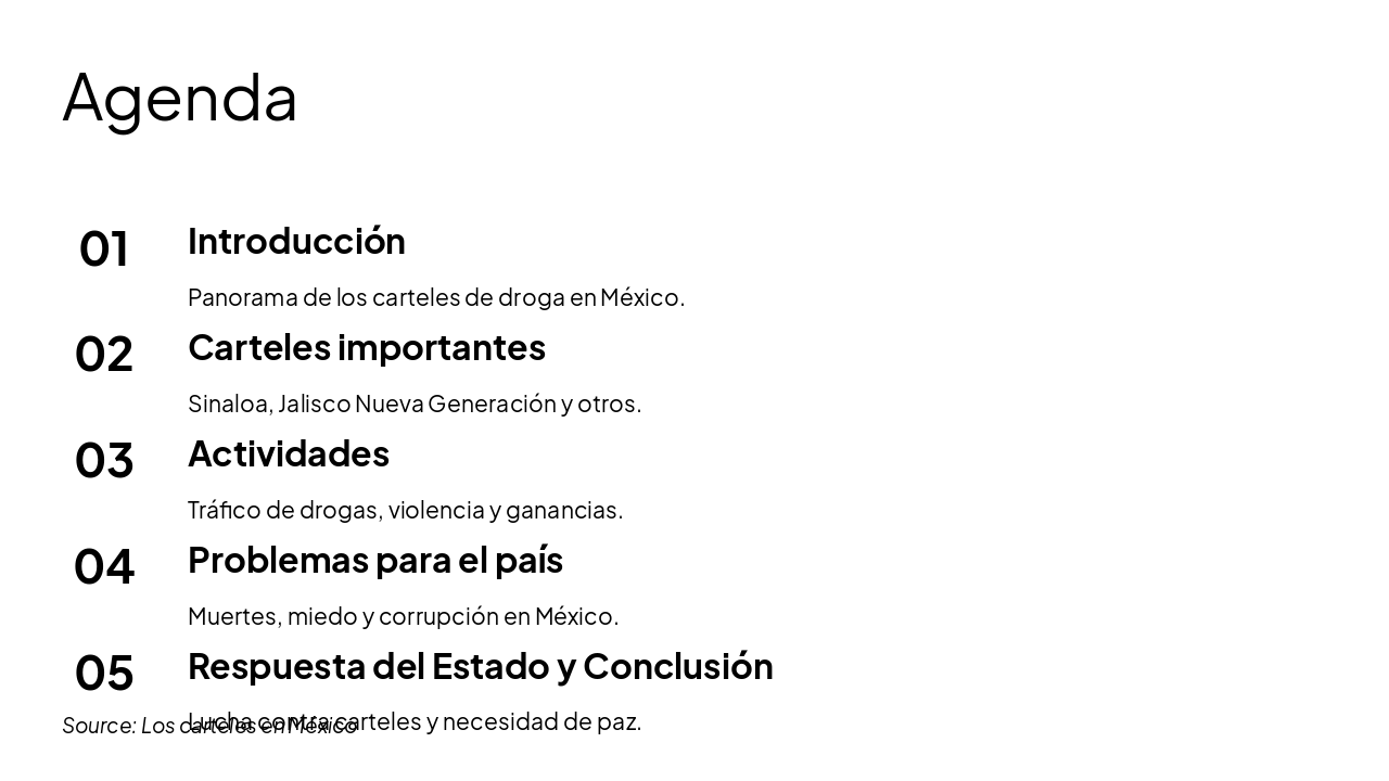 This agenda slide outlines Mexican drug cartels, starting with an introduction, key groups like Sinaloa and Jalisco Nueva Generación, and their activities in drug trafficking, violence, and profits. It then covers national problems like deaths, fear, and corruption, ending with the state's response and a call for peace.