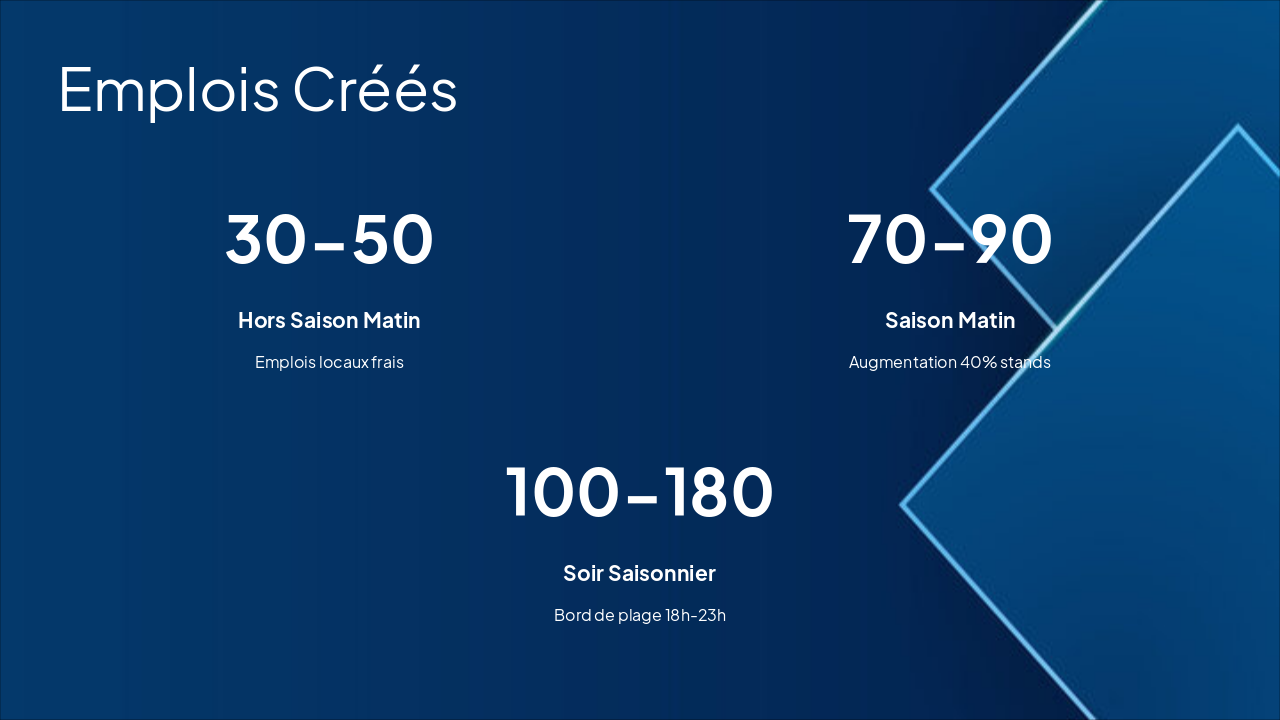 Design : fond bleu clair, typographie lisible, icônes simples (emplois, stands, plage, etc.).