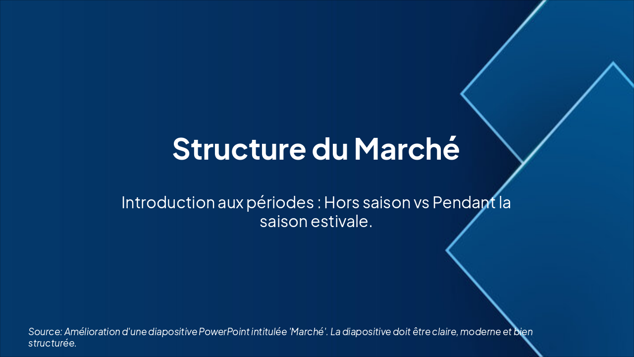 This section header slide, titled "Marché", features the main title "Structure du Marché". Its subtitle introduces the comparison between off-season and peak summer season periods.