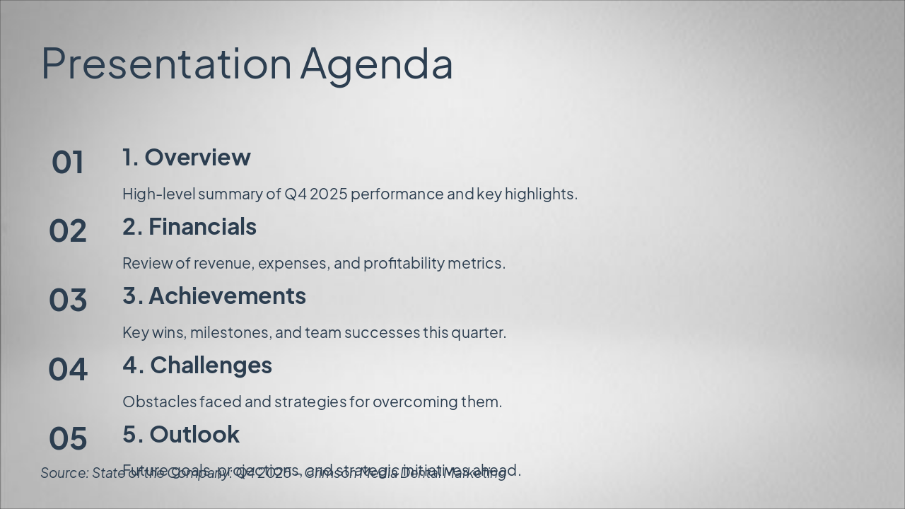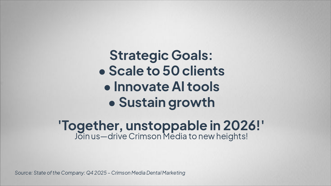Future goals, projections, and strategic initiatives ahead. Source: State of the Company: Q4 2025 – Crimson Media Dental Marketing
