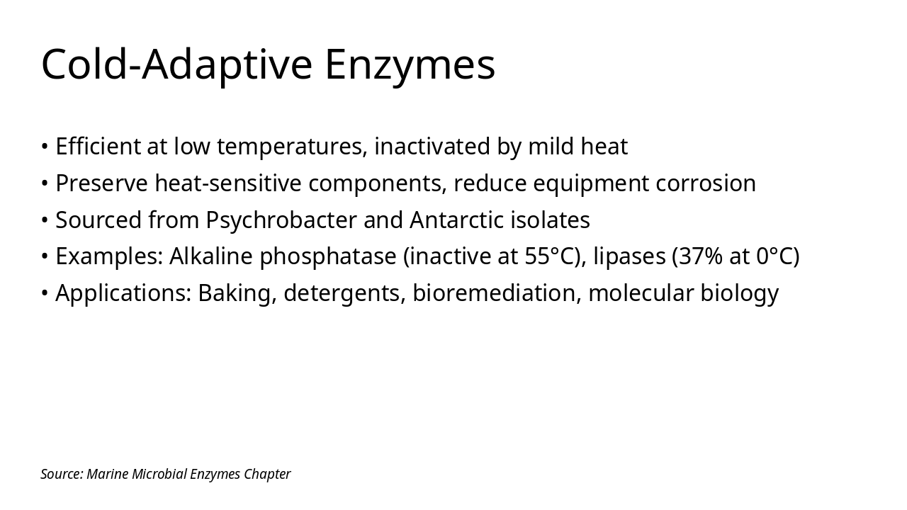 Cold-active enzymes catalyze reactions efficiently at low temperatures and are easily inactivated by mild heat. They are vital where low-temperature processing is required to: