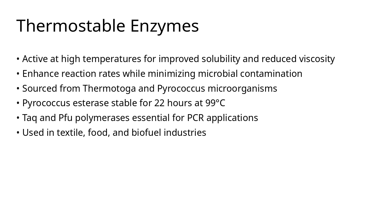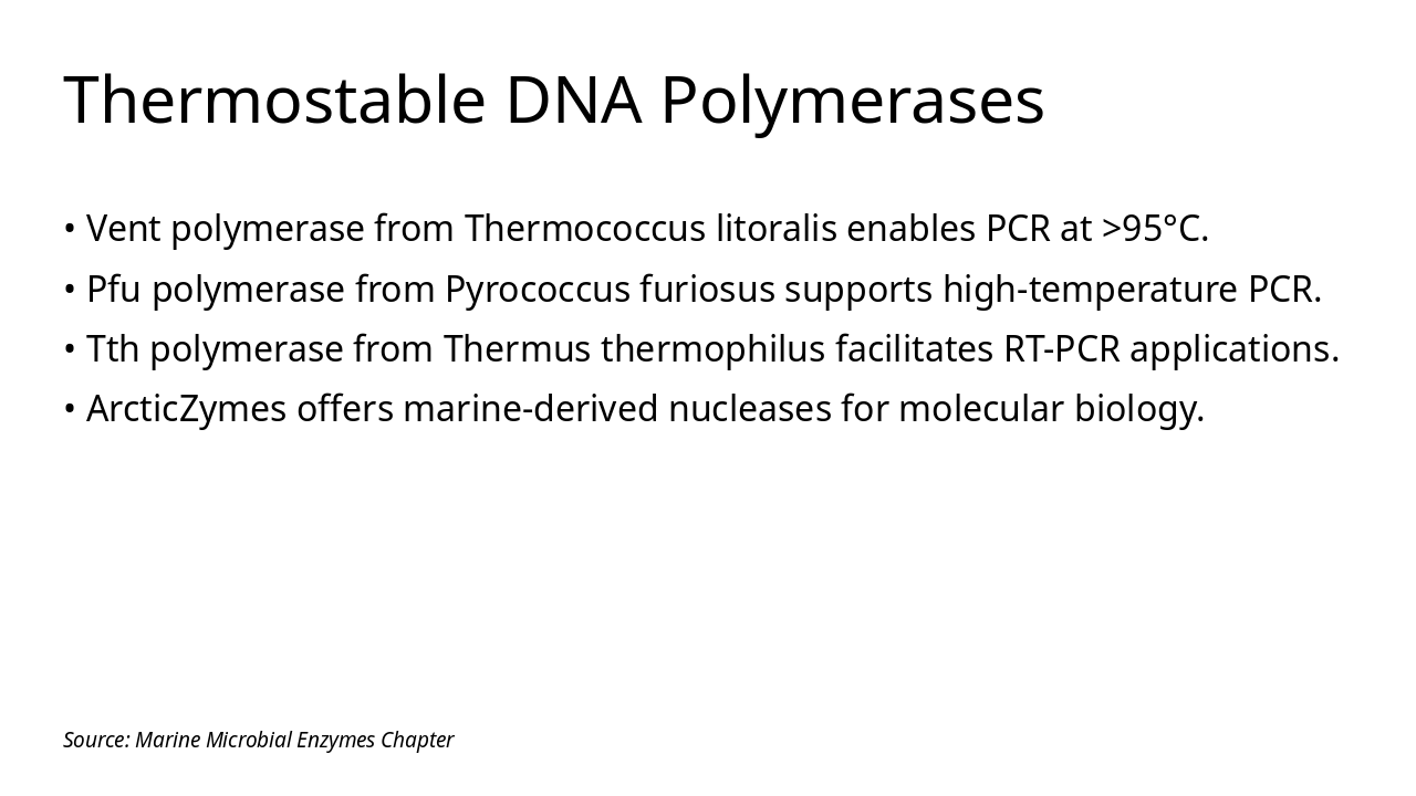 Marine sources include Thermotoga, Thermus, Thermococcus, Pyrococcus, Bacillus, and Sulfolobus. Archaeal enzymes in particular display resistance to detergents, high pressure, organic solvents, and proteolytic degradation.