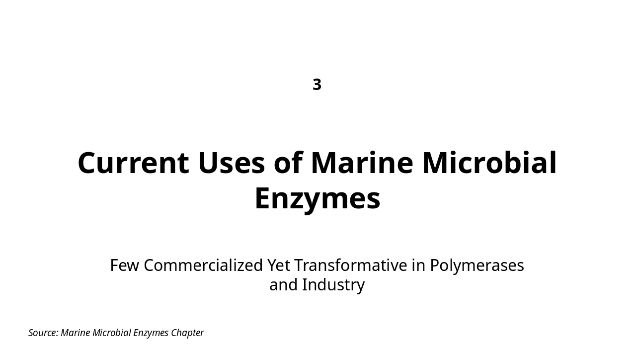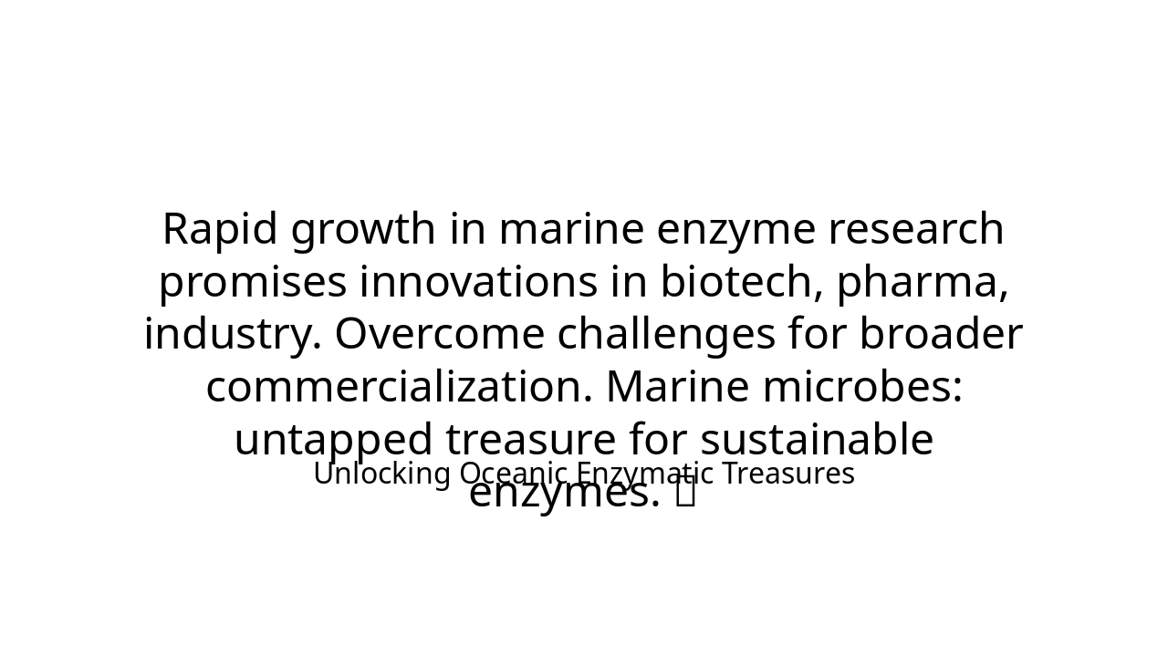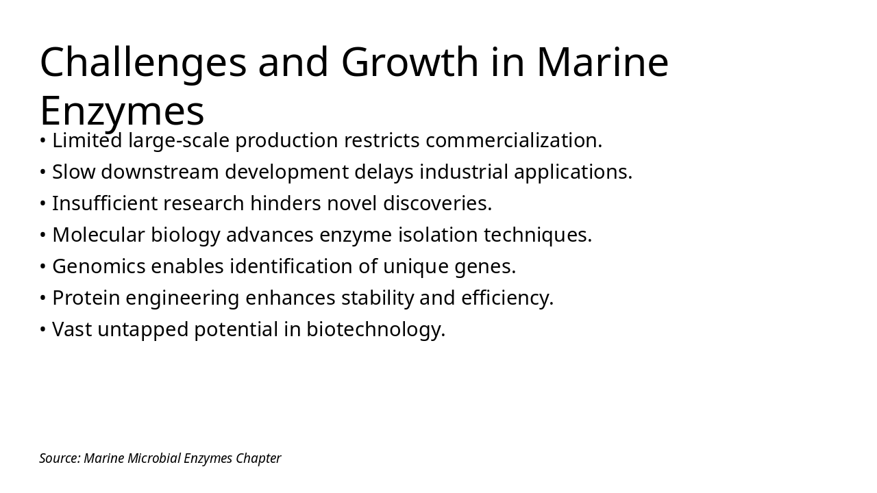 Despite vast potential, the commercial exploitation of marine enzymes faces challenges: limited large-scale production, slow downstream process development, and insufficient application-oriented research. Nonetheless, the field is rapidly growing with advances in molecular biology, genomics, and protein engineering.