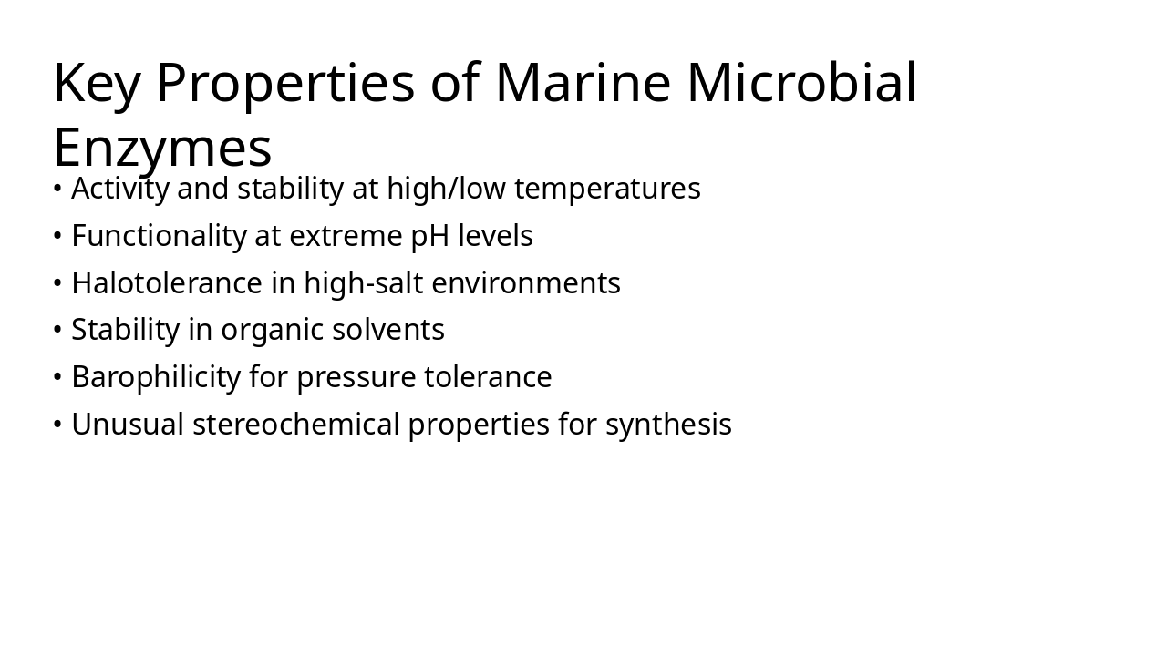 Some halotolerant enzymes also show organic solvent tolerance, allowing catalysis in biphasic or solvent-rich environments—ideal for synthesis of chiral pharmaceuticals.