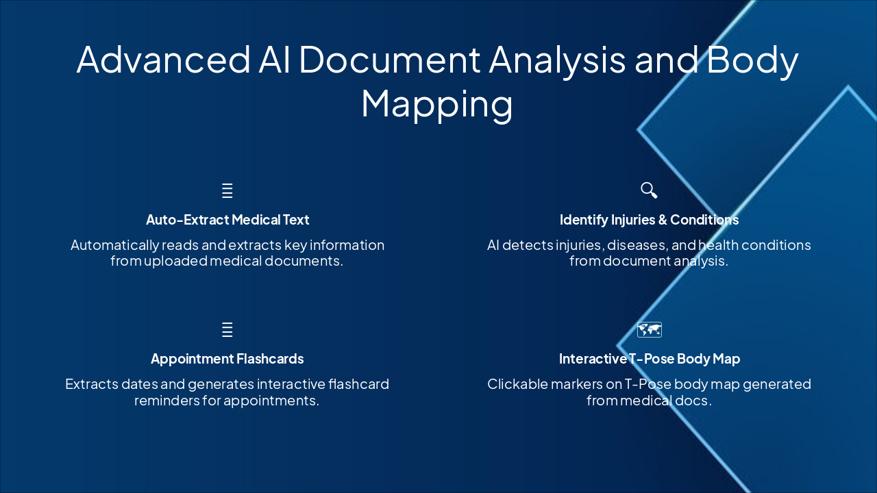{ "features": [ { "icon": "📄", "heading": "Auto-Extract Medical Text", "description": "Automatically reads and extracts key information from uploaded medical documents." }, { "icon": "🔍", "heading": "Identify Injuries & Conditions", "description": "AI detects injuries, diseases, and health conditions from document analysis." }, { "icon": "📅", "heading": "Appointment Flashcards", "description": "Extracts dates and generates interactive flashcard reminders for appointments." }, { "icon": "🗺️", "heading": "Interactive T-Pose Body Map", "description": "Clickable markers on T-Pose body map generated from medical docs." } ] }