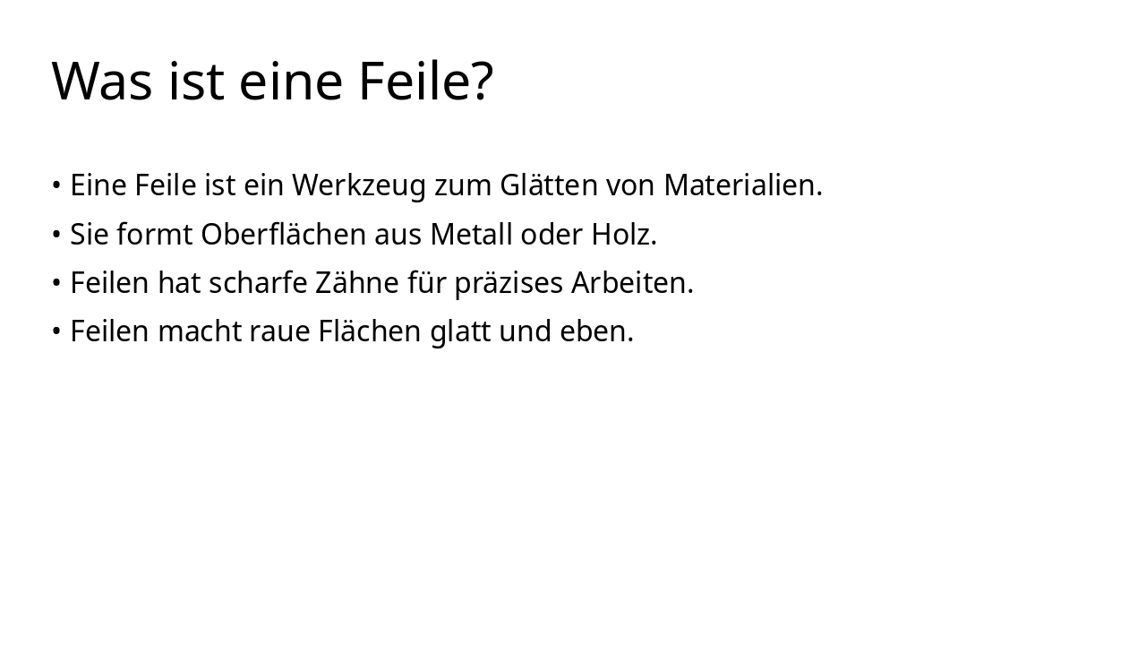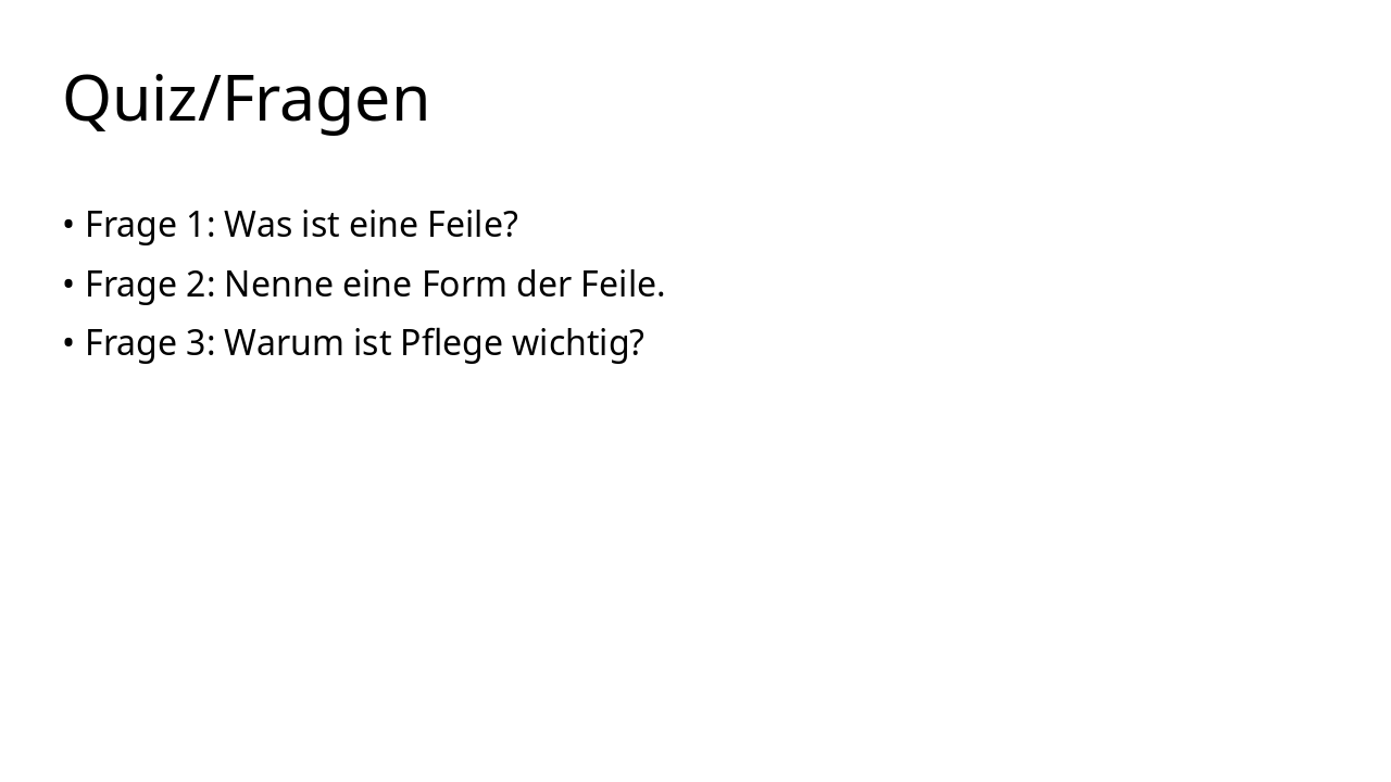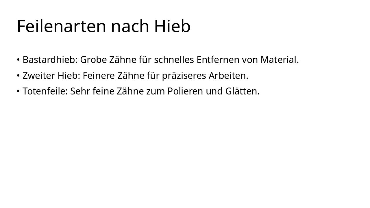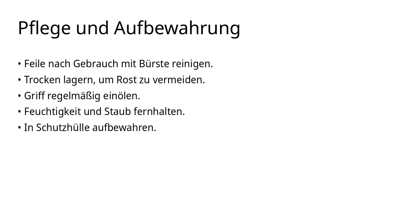 Vor 3000 v. Chr.: Erste Feilen aus Stein Die ältesten Feilen wurden aus Stein gemacht, vor mehr als 3000 Jahren. Mittelalter: Metallfeilen im Mittelalter Im Mittelalter entstanden die ersten Feilen aus Metall für bessere Bearbeitung. 19. Jahrhundert: Moderne Feilen mit Maschinen Seit dem 19. Jahrhundert werden Feilen mit Maschinen hergestellt und verbessert.