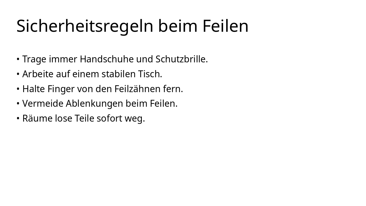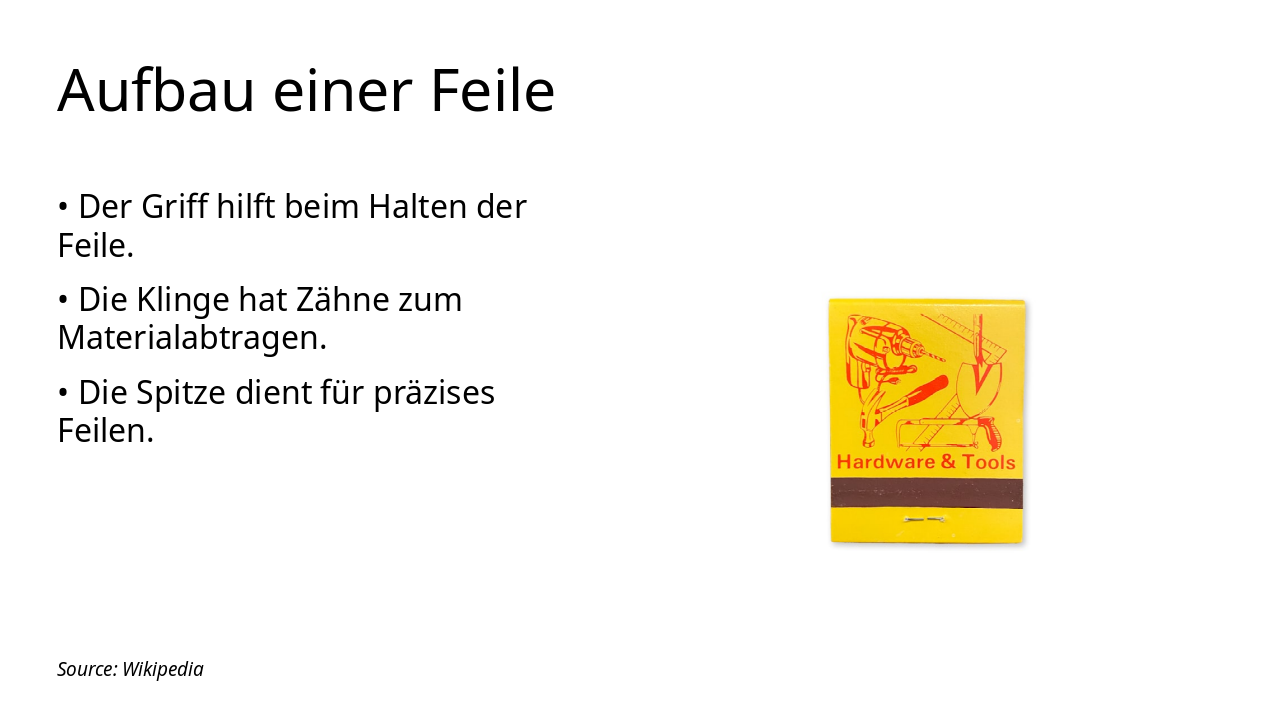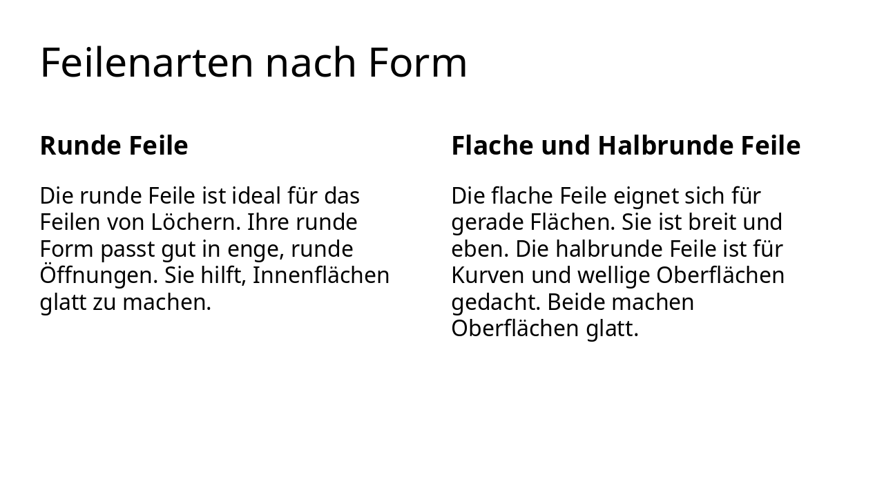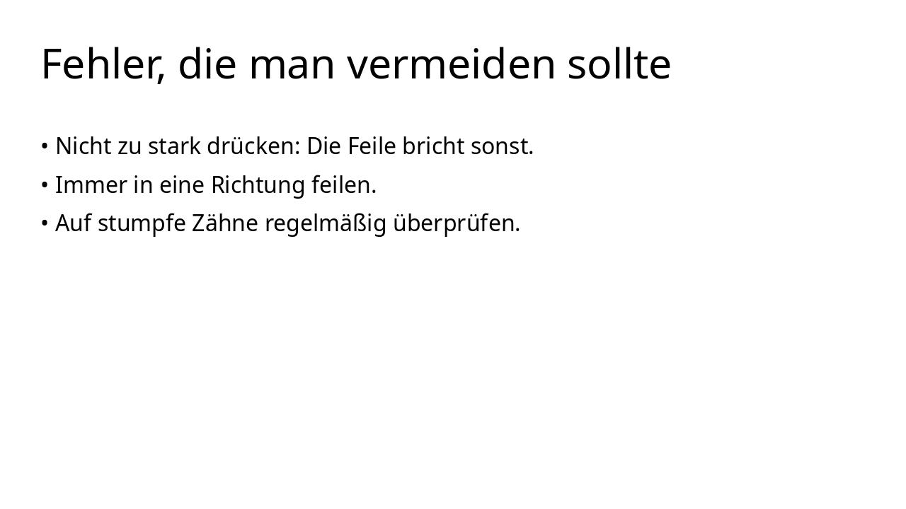 Vor 3000 v. Chr.: Erste Feilen aus Stein Die ältesten Feilen wurden aus Stein gemacht, vor mehr als 3000 Jahren. Mittelalter: Metallfeilen im Mittelalter Im Mittelalter entstanden die ersten Feilen aus Metall für bessere Bearbeitung. 19. Jahrhundert: Moderne Feilen mit Maschinen Seit dem 19. Jahrhundert werden Feilen mit Maschinen hergestellt und verbessert.