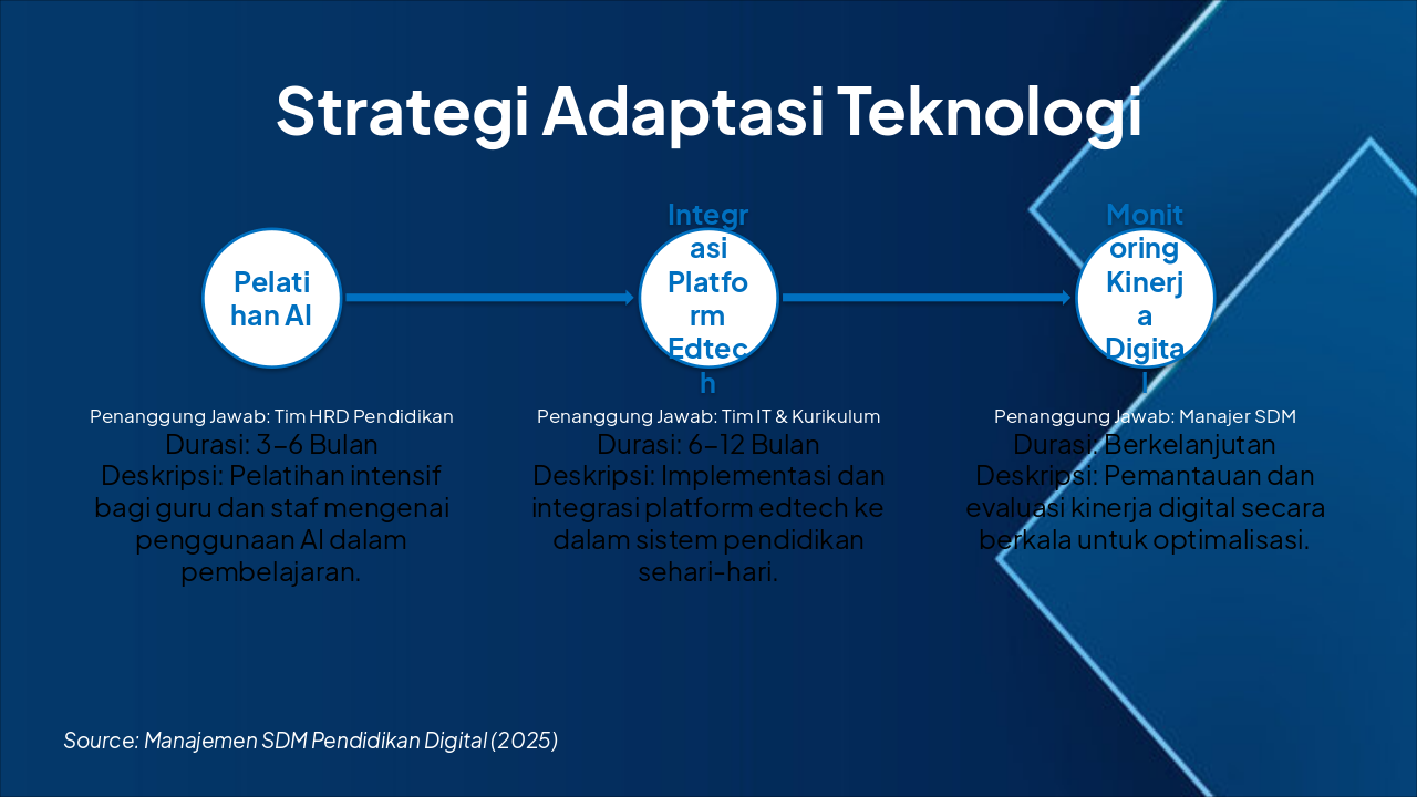 Tahap: Pelatihan AI, integrasi platform edtech, monitoring kinerja digital. Alur adaptasi bertahap untuk SDM pendidikan.