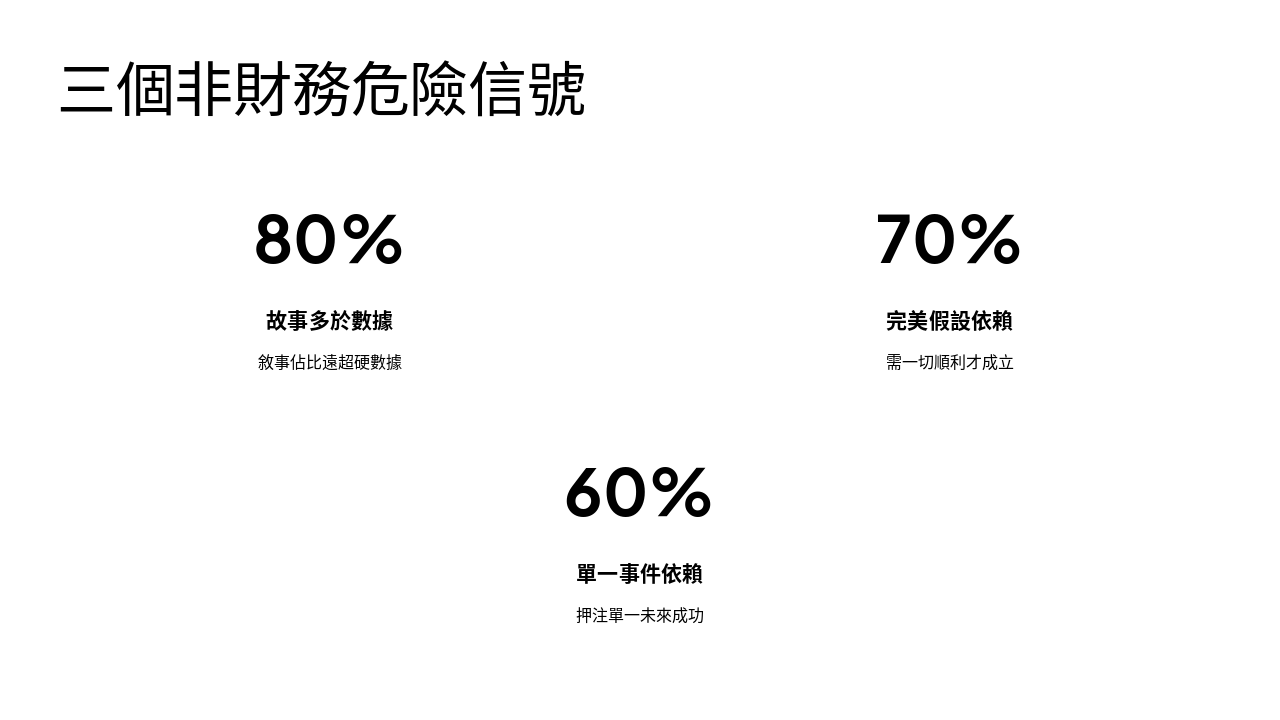 這張統計幻燈片列出三個非財務危險信號:80% 的案例中故事敘述遠超硬數據、70% 依賴完美假設(需一切順利才成立),以及 60% 押注單一未來事件成功。這些信號警示投資提案的潛在風險。