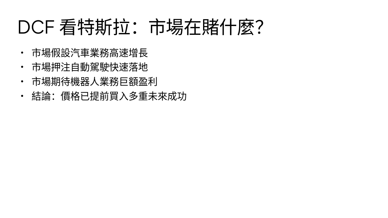 這張投影片聚焦於核心問題定義與估值本質,不討論特斯拉優劣,而是評估其價格是否合理。估值即將當前價格轉譯為未來假設,並強調「好公司,也可能是壞價格」的金句。