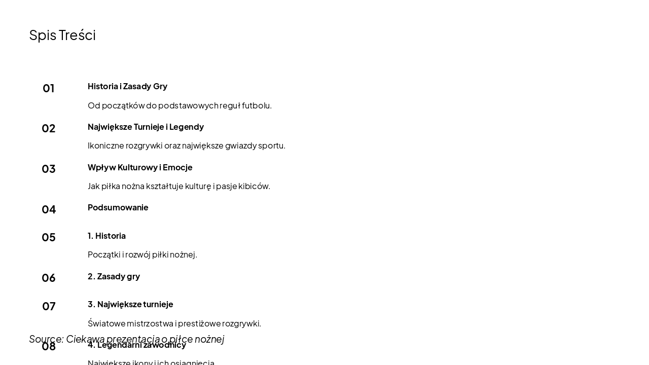 Ta agenda prezentuje spis treści prelekcji o piłce nożnej, obejmujący historię i zasady gry, największe turnieje oraz legendy sportu. Kolejne punkty szczegółowo omawiają rozwój futbolu, reguły, ikoniczne rozgrywki, osiągnięcia gwiazd, wpływ kulturowy, emocje kibiców i podsumowanie.