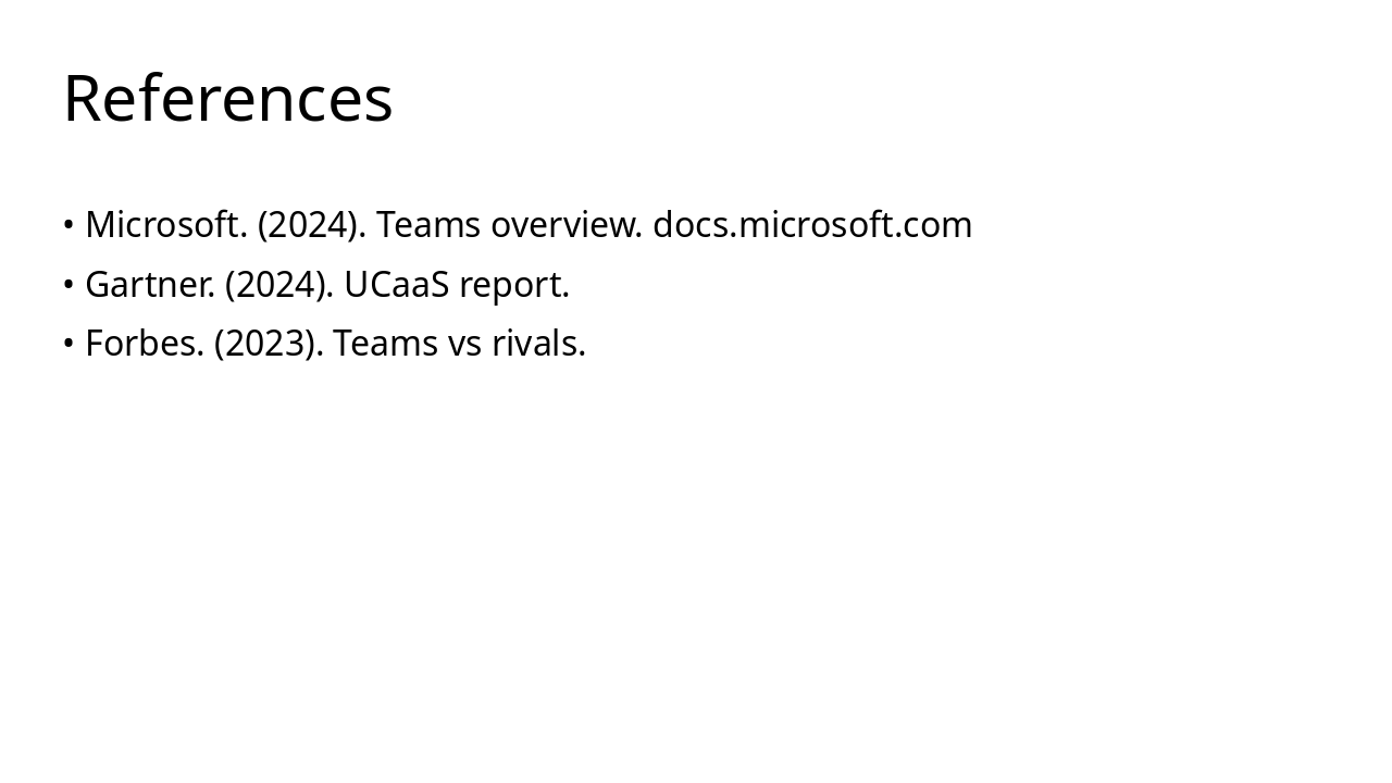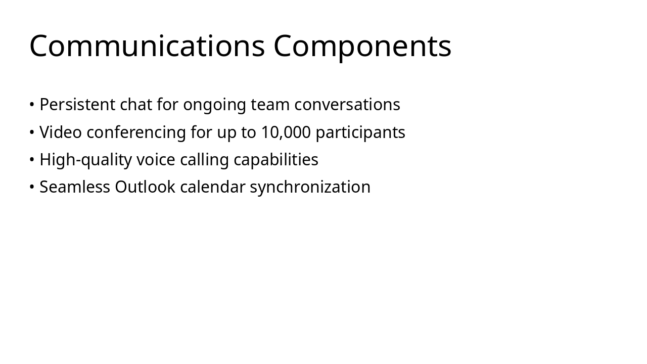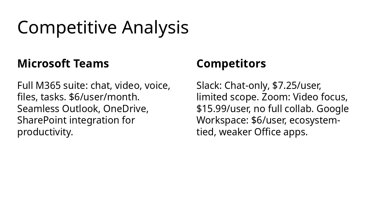 | Full M365 suite: chat, video, voice, files, tasks. $6/user/month. Seamless Outlook, OneDrive, SharePoint integration for productivity. | Slack: Chat-only, $7.25/user, limited scope. Zoom: Video focus, $15.99/user, no full collab. Google Workspace: $6/user, ecosystem-tied, weaker Office apps. |