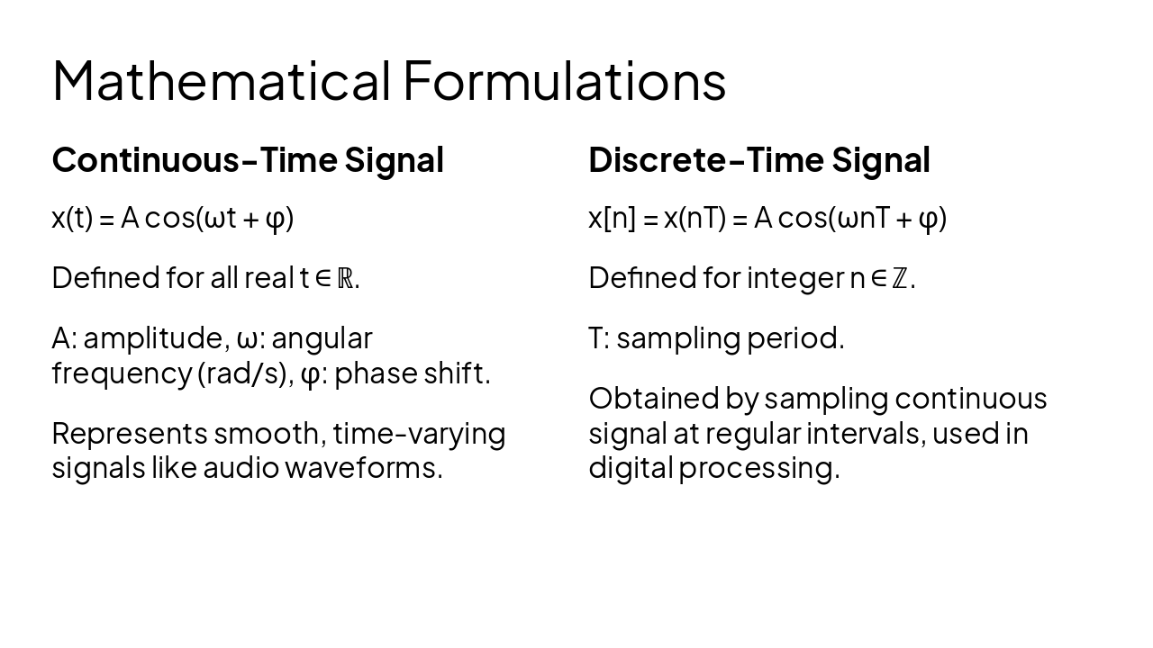 The slide contrasts continuous-time signals, defined as x(t) = A cos(ωt + φ) for all real t with parameters amplitude A, angular frequency ω, and phase φ, representing smooth waveforms like audio. Discrete-time signals are shown as x[n] = A cos(ωnT + φ) for integer n, sampled from continuous signals at period T for digital processing.
