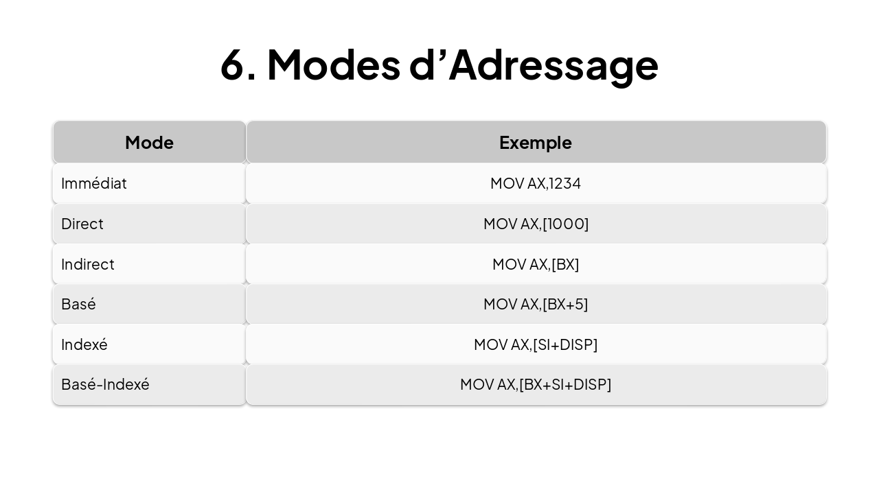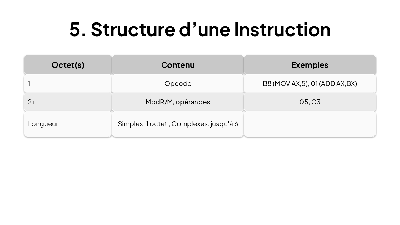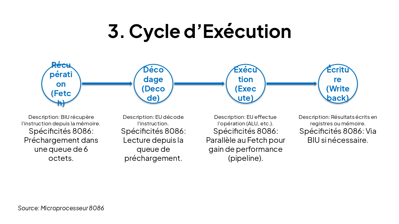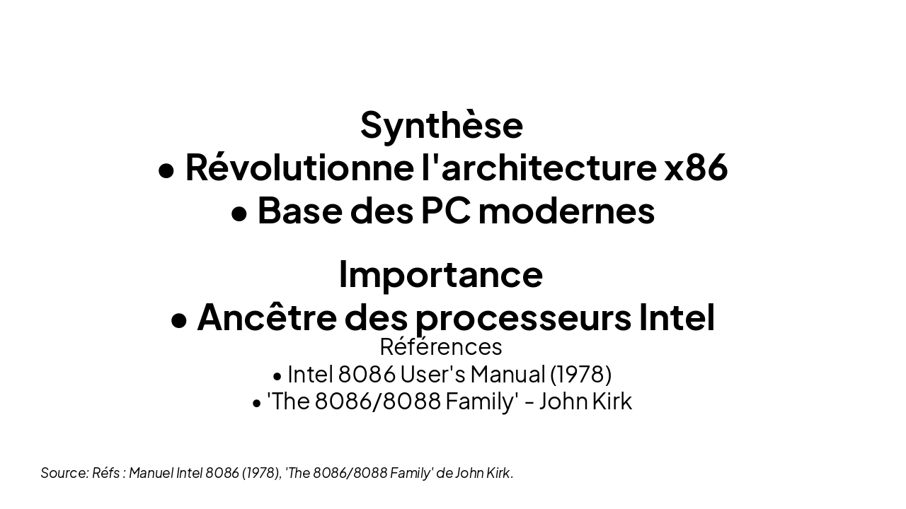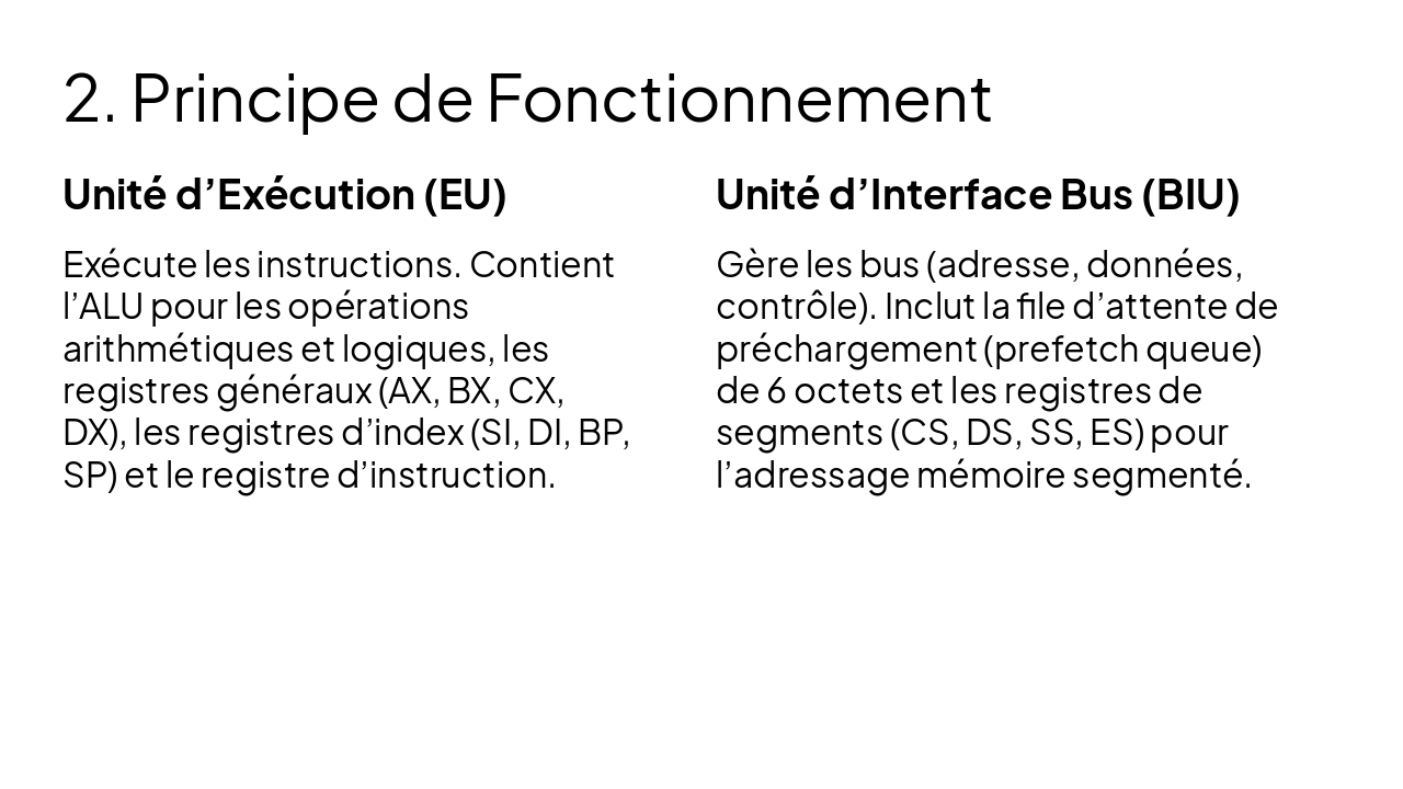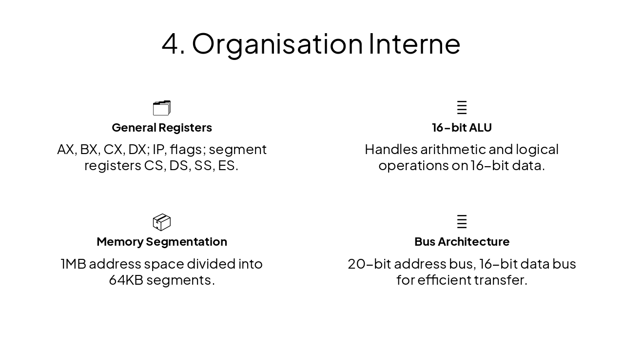 { "features": [ { "icon": "🗂️", "heading": "General Registers", "description": "AX, BX, CX, DX; IP, flags; segment registers CS, DS, SS, ES." }, { "icon": "🧮", "heading": "16-bit ALU", "description": "Handles arithmetic and logical operations on 16-bit data." }, { "icon": "📦", "heading": "Memory Segmentation", "description": "1MB address space divided into 64KB segments." }, { "icon": "🚌", "heading": "Bus Architecture", "description": "20-bit address bus, 16-bit data bus for efficient transfer." } ] }