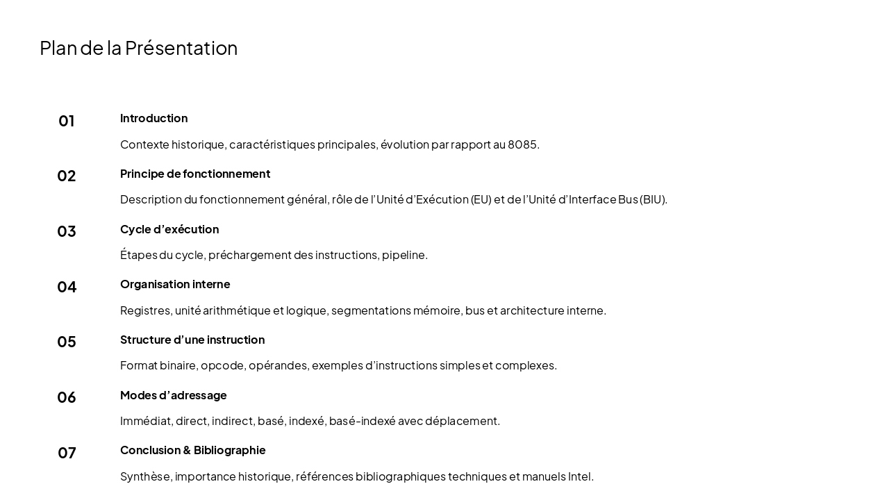 The "4. Organisation Interne" slide features a grid highlighting key internal components of a processor: general registers (AX, BX, CX, DX, IP, flags, CS, DS, SS, ES), a 16-bit ALU for arithmetic/logical operations, memory segmentation (1MB space in 64KB segments), and bus architecture (20-bit address, 16-bit data). This outlines efficient 16-bit data handling and addressing.