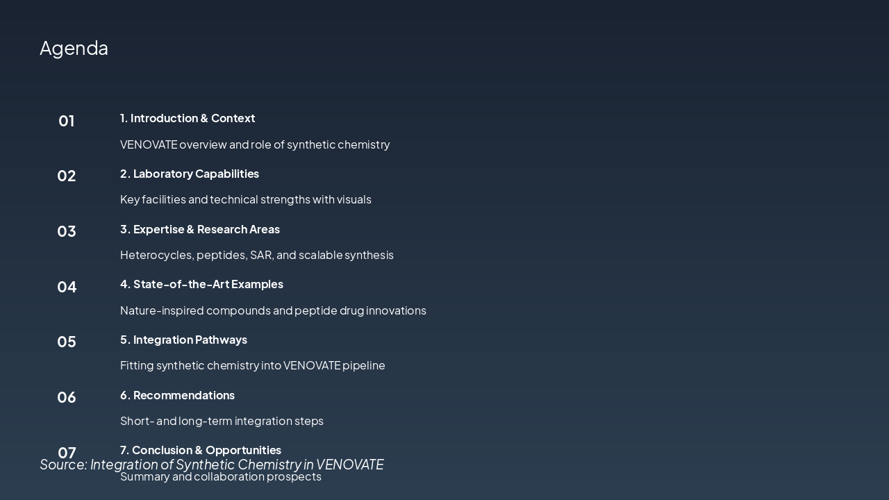 The agenda outlines a presentation on VENOVATE's synthetic chemistry, starting with an introduction to its overview and role, followed by laboratory capabilities, expertise in areas like heterocycles, peptides, SAR, and scalable synthesis. It continues with state-of-the-art examples of nature-inspired compounds and peptide innovations, integration pathways into the VENOVATE pipeline, recommendations for short- and long-term steps, and concludes with opportunities for collaboration.