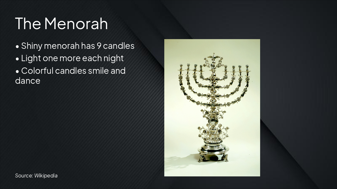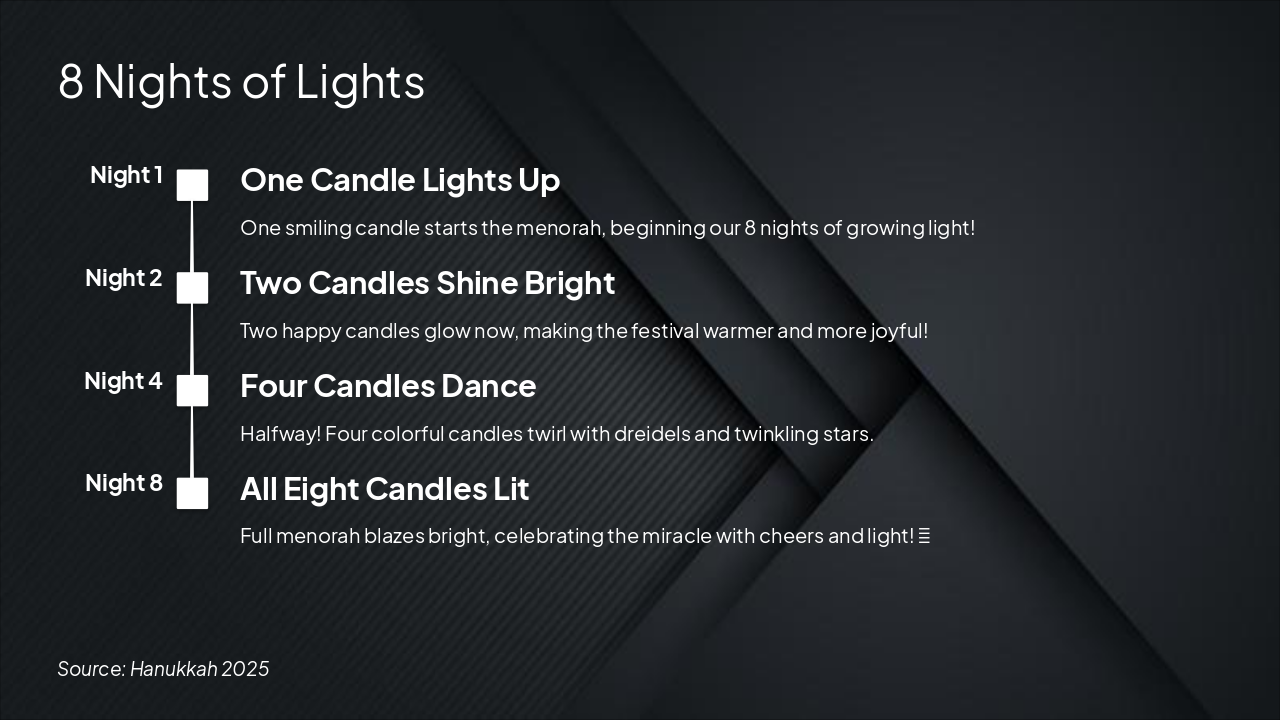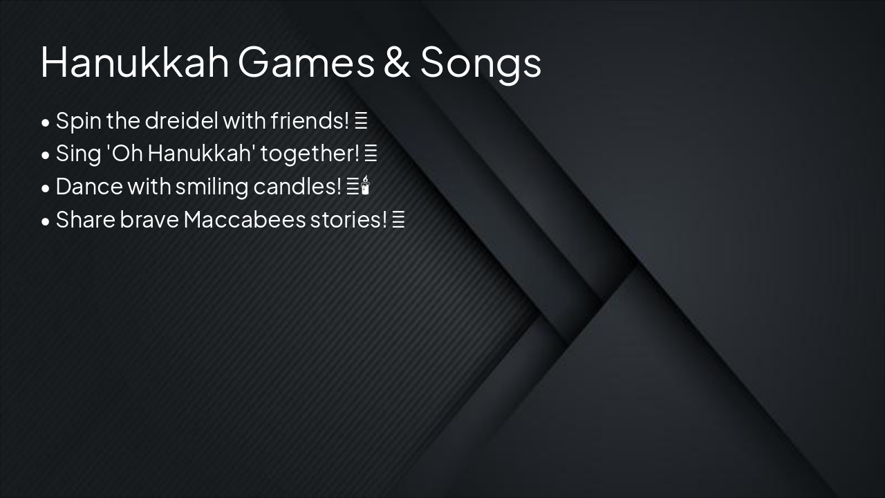 { "features": [ { "icon": "π₯", "heading": "Crispy Potato Latkes", "description": "Golden, crunchy potato pancakes super yummy with applesauce! Perfect Hanukkah treat." }, { "icon": "π©", "heading": "Sweet Sufganiyot Donuts", "description": "Jelly-filled donuts dusted with sugar. So sweet and fun to eat!" }, { "icon": "π¬", "heading": "Blue Hanukkah Candies", "description": "Bright blue treats matching the flag. Yummy for kids' smiles!" }, { "icon": "π§", "heading": "White Frosted Goodies", "description": "Fluffy white cupcakes or cookies. Soft, sweet, and festive fun!" }, { "icon": "πͺ", "heading": "Golden Chocolate Gelt", "description": "Shiny chocolate coins to play and munch. Hanukkah delight!" } ] }