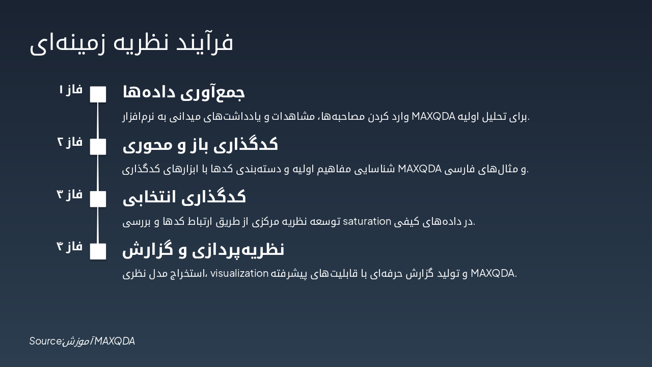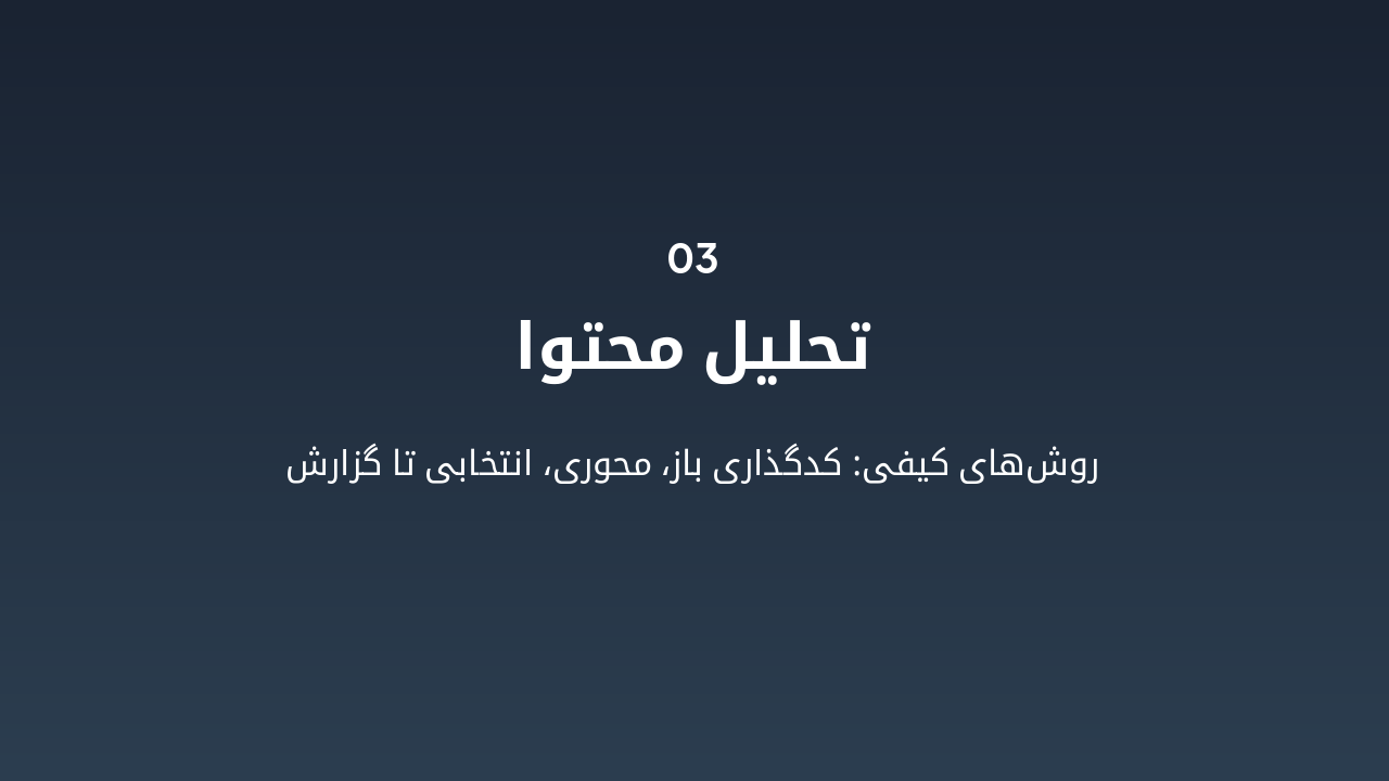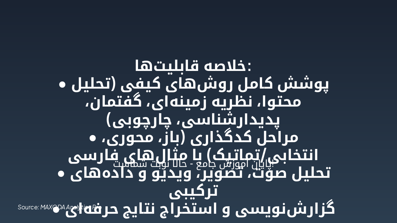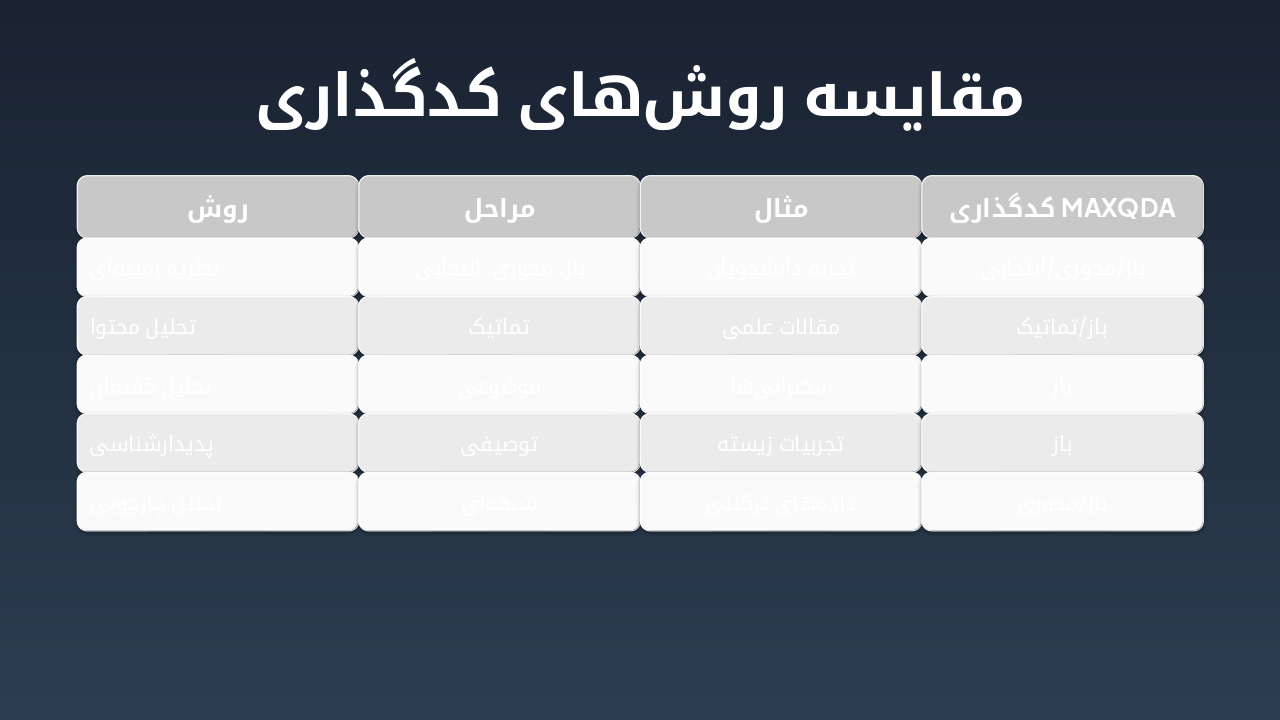 { "headers": [ "روش", "مراحل", "مثال", "کدگذاری MAXQDA" ], "rows": [ [ "نظریه زمینهای", "باز، محوری، انتخابی", "تجربه دانشجویان", "باز/محوری/انتخابی" ], [ "تحلیل محتوا", "تماتیک", "مقالات علمی", "باز/تماتیک" ], [ "تحلیل گفتمان", "موضوعی", "سخنرانیها", "باز" ], [ "پدیدارشناسی", "توصیفی", "تجربیات زیسته", "باز" ], [ "تحلیل چارچوبی", "شبکهای", "دادههای ترکیبی", "باز/محوری" ] ] }