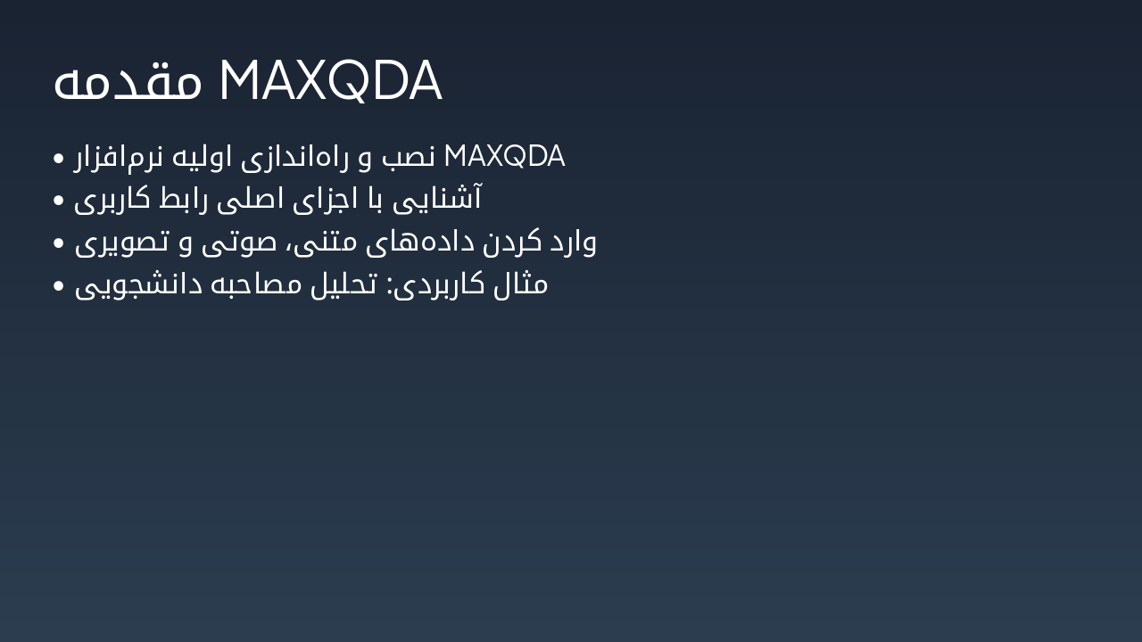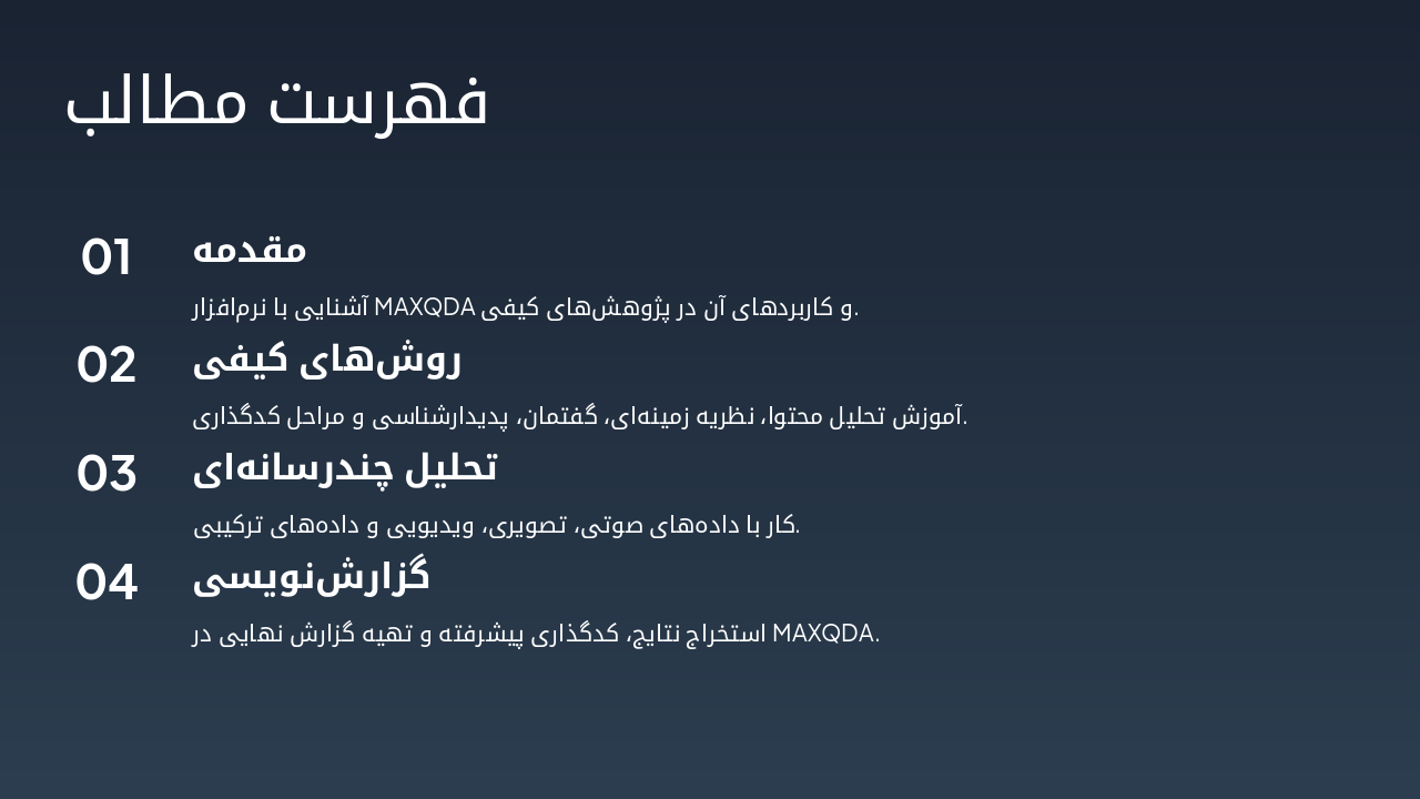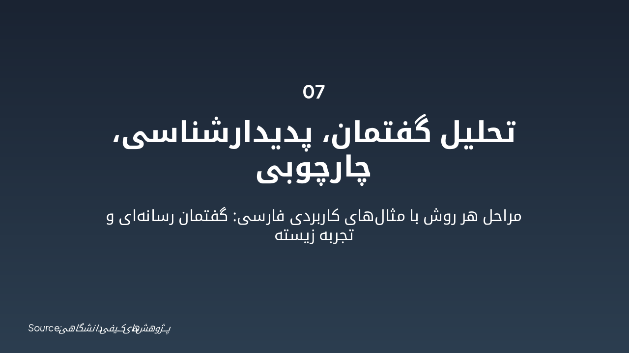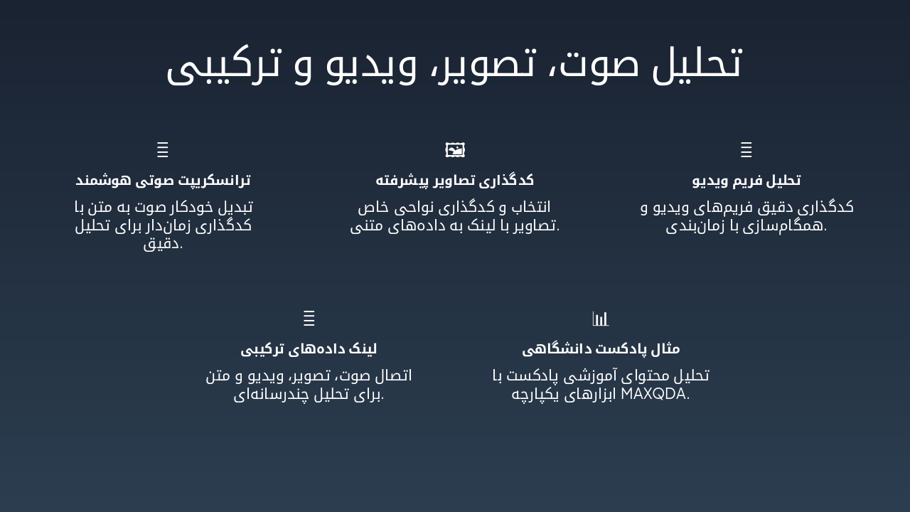 { "headers": [ "روش", "مراحل", "مثال", "کدگذاری MAXQDA" ], "rows": [ [ "نظریه زمینهای", "باز، محوری، انتخابی", "تجربه دانشجویان", "باز/محوری/انتخابی" ], [ "تحلیل محتوا", "تماتیک", "مقالات علمی", "باز/تماتیک" ], [ "تحلیل گفتمان", "موضوعی", "سخنرانیها", "باز" ], [ "پدیدارشناسی", "توصیفی", "تجربیات زیسته", "باز" ], [ "تحلیل چارچوبی", "شبکهای", "دادههای ترکیبی", "باز/محوری" ] ] }