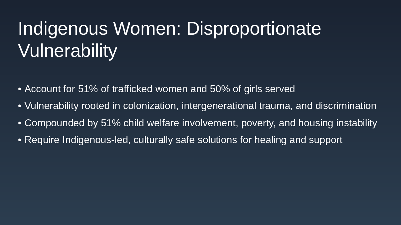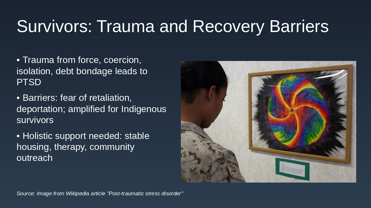 The statistics clearly show the scale of the crisis, but they don't capture the profound and lasting impact on survivors, who face immense trauma and significant barriers to recovery. Traffickers maintain control through force, coercion, isolation, and psychological abuse, often using debt bondage to create dependency and prevent escape. This exploitation, whether sexual or labor-based, results in lasting trauma, including PTSD, complex trauma, and mental health challenges like hypervigilance and difficulty trusting authority. Recovery is further complicated by systemic barriers. Many survivors fear retaliation, deportation, or criminalization, which prevents them from seeking help. This fear is amplified for Indigenous survivors, who carry the additional burden of historical trauma and deep mistrust of state institutions. True recovery requires sustained, holistic support—stable housing, employment, and specialized mental health therapy. This is why survivor-led initiatives and outreach workers are so vital; they are often the critical first point of contact and the most trusted guides through the recovery process. But even with this support, significant gaps remain.