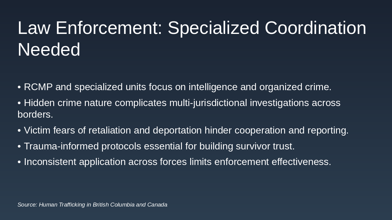 While the Criminal Code provides the legal framework, effective law enforcement against human trafficking demands specialized coordination and a trauma-informed approach. We see that the RCMP and municipal police are attempting to coordinate through units like the Counter Human Trafficking Unit, which focuses on organized crime and intelligence gathering. But remember, the hidden nature of this crime and the multi-jurisdictional complexity—crossing provincial and international borders—significantly complicate investigations. A major challenge is victim engagement; fear of retaliation, deportation, or even criminalization prevents many survivors from cooperating, leading to underreporting and low conviction rates. This is why consistent application of trauma-informed protocols is essential, but it remains inconsistent across different police forces. We need to move beyond simply prosecuting traffickers and focus on building trust with survivors so they feel safe enough to come forward. And that trust is often built not by police alone, but by the victim services we'll discuss next.