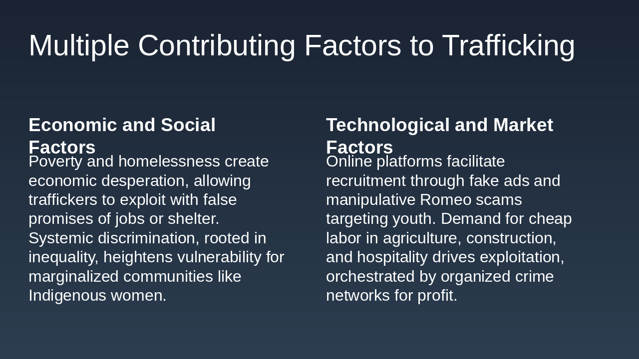 Trafficking is sustained by a convergence of economic, social, and technological factors that create and exploit vulnerability. Poverty and homelessness are primary drivers, creating economic desperation that traffickers manipulate with false promises of housing or employment. We also see technology playing a massive role, with online platforms and social media used for recruitment through fake job ads and manipulative "Romeo" scams targeting youth. Furthermore, market demand is a huge factor; the desire for cheap labour in sectors like agriculture, construction, and hospitality fuels labour trafficking. And let's not forget the role of organized crime networks, which orchestrate these operations purely for profit. Understanding these root causes—from systemic discrimination to online recruitment—is essential for designing targeted interventions. Now, let's look at the legal tools Canada has put in place to fight these complex factors.
