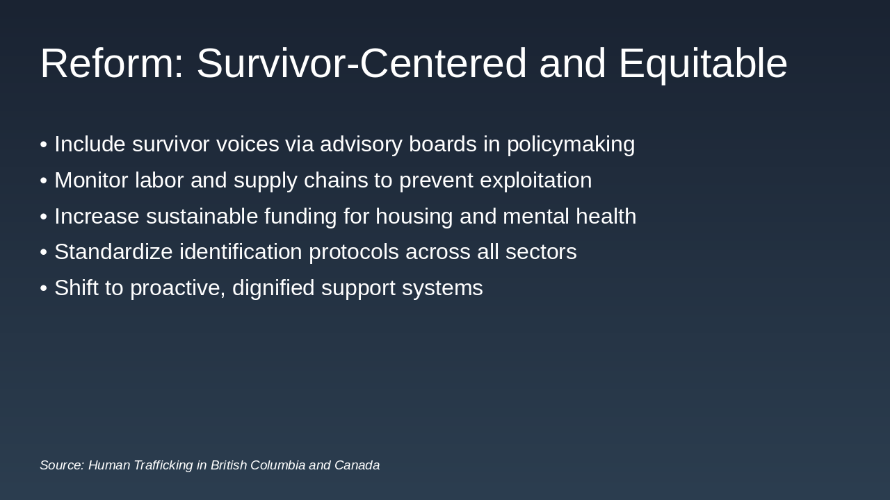 Given the critical service gaps we just discussed, reform must be centered on the survivor experience and driven by equity. This means we need to stop designing programs for survivors and start designing them with survivors, formally including their voices in policy-making through advisory boards and consultation processes. We also need to look beyond sexual exploitation and expand monitoring of labor and supply chains to hold employers accountable for exploitation in our workplaces. Crucially, we must increase dedicated, sustainable funding for housing, mental health, and culturally safe Indigenous-led services. Precarious year-to-year funding prevents long-term planning and stability. We also need to standardize victim identification protocols across all sectors—law enforcement, health care, and social services—so that victims are recognized and supported no matter where they first seek help. These actions move us from a reactive system to a proactive one, ensuring our policies reflect the dignity and justice survivors deserve. This brings us to our final point: how coordinated action is the only way to achieve these goals.