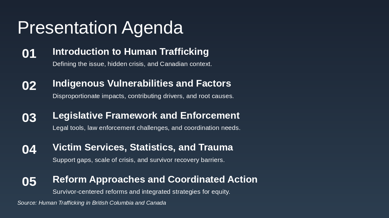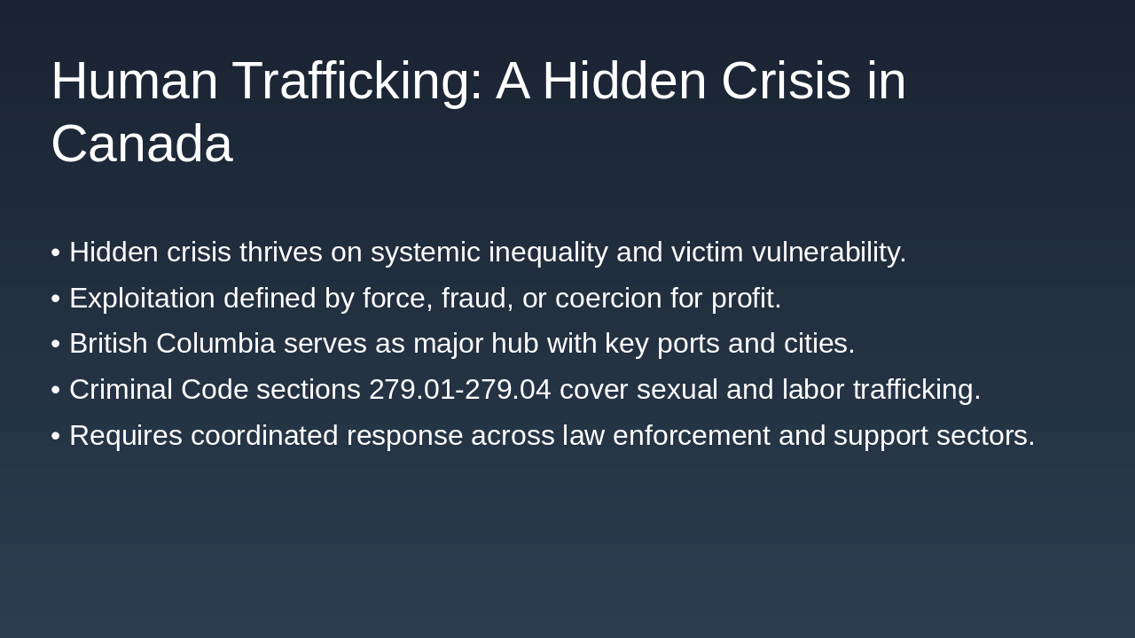 We're here today to examine the critical issue of human trafficking, focusing specifically on its manifestation in British Columbia and across Canada. This is not just a global issue; it is a serious domestic crisis that demands our immediate attention and coordinated policy response. We will explore the systemic factors that drive this exploitation, the disproportionate impact on vulnerable communities, and the legislative framework we have in place to combat it. Our goal is to move beyond awareness and focus on actionable insights for law enforcement, policy makers, and service providers. Understanding the scope and complexity of trafficking is the first step toward creating effective, survivor-centered solutions. We need to look at this through a lens of justice and equity. Let's begin by defining what we mean when we talk about human trafficking in the Canadian context.