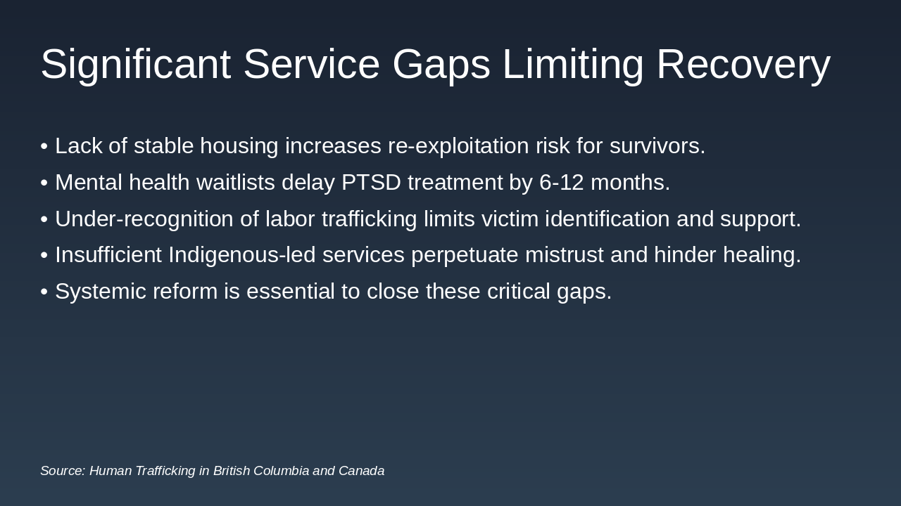 We've established the profound trauma survivors face, but the reality is that significant service gaps severely limit their ability to recover and reintegrate. The lack of stable, long-term housing is perhaps the most critical failure; without a safe place to live, survivors remain highly vulnerable to re-exploitation, turning emergency shelters into temporary holding patterns rather than true launchpads for recovery. We also see a critical shortage in specialized mental health services, with waitlists for trauma-informed counselling often stretching six to twelve months, which is simply unacceptable when dealing with complex PTSD. Furthermore, our systems remain heavily focused on sexual exploitation, meaning labour trafficking is chronically under-recognized, leaving victims in sectors like agriculture and construction without the necessary support. Finally, the lack of culturally safe, Indigenous-led services perpetuates historical mistrust and prevents healing for the most disproportionately affected population. These gaps are not just inconveniences; they are systemic failures that demand immediate, comprehensive reform. We must now turn our attention to the concrete steps required to build a truly survivor-centered and equitable system.
