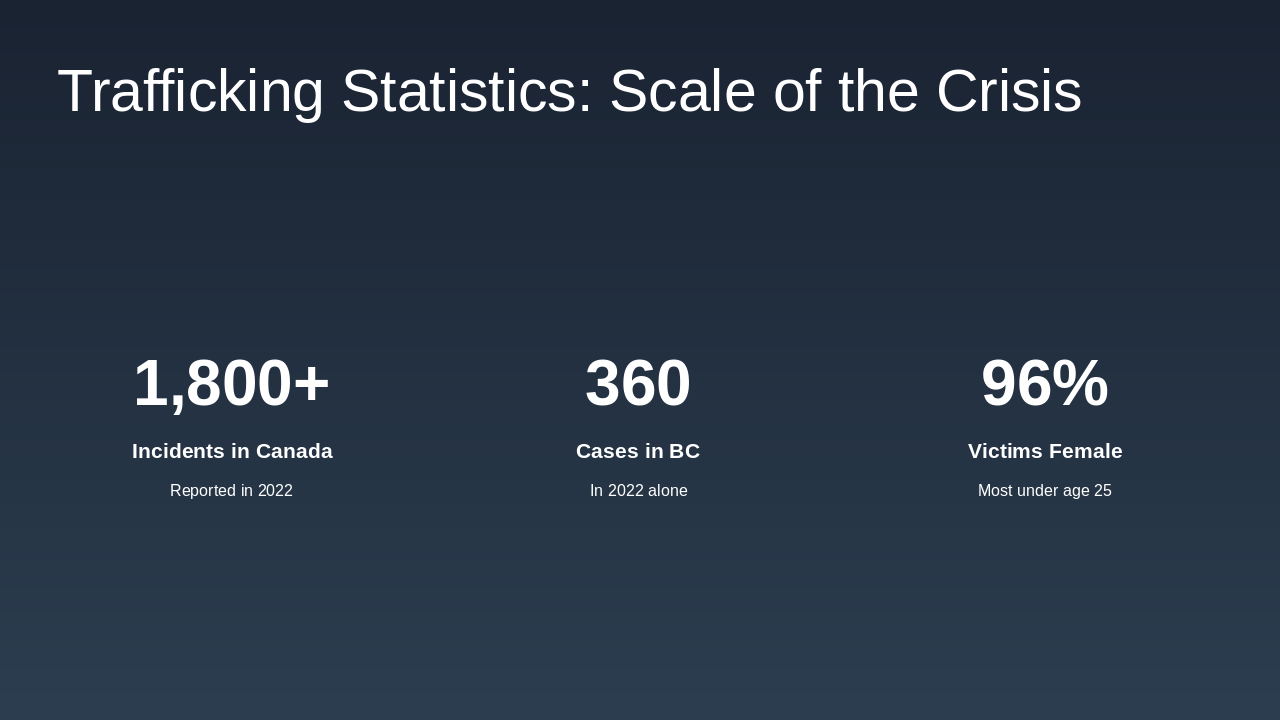 The statistics we have, while alarming, only reveal the tip of the iceberg of this hidden crisis. In 2022, Canada reported over 1,800 trafficking incidents, with 360 of those occurring right here in British Columbia. These numbers underscore the scale of the problem. We see a clear demographic pattern: 96% of victims are female, and the majority are under the age of 25. This data confirms that trafficking disproportionately targets young women and girls. But the critical context here is that these are only police-reported incidents. The actual prevalence is substantially higher due to the hidden nature of the crime, victim reluctance to report, and the difficulty of proving exploitation in court. The low conviction rates we mentioned earlier further contribute to this underestimation. So, while these numbers give us a baseline, we must remember that behind every statistic is a survivor who has endured profound trauma and faces immense barriers to recovery.