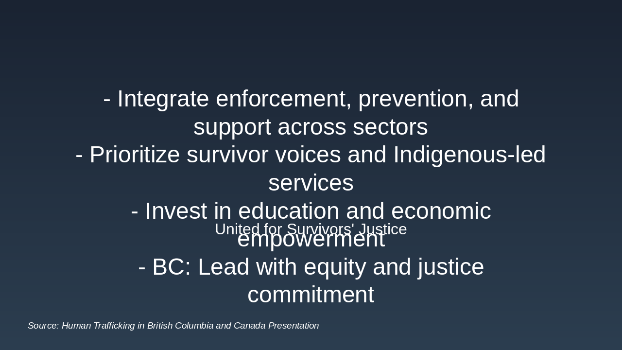 Ultimately, ending human trafficking requires coordinated action that integrates all the elements we've discussed: strong enforcement, prevention, and robust, equitable support. This coordination must span government, law enforcement, NGOs, and communities, ensuring we are all working from the same playbook. The core principle must be that survivor voices guide program design; we cannot effectively address needs we do not fully understand. For British Columbia, this means prioritizing Indigenous-led, culturally safe services to address historical trauma and build essential trust within communities. We must also invest heavily in prevention through education, awareness, and economic empowerment, which are the most effective ways to reduce vulnerability in the first place. Ending trafficking is not a short-term project; it requires a sustained commitment to dignity, equity, and justice for all. BC has the opportunity to lead by example, establishing policies and programs that truly prioritize the safety and recovery of every survivor.